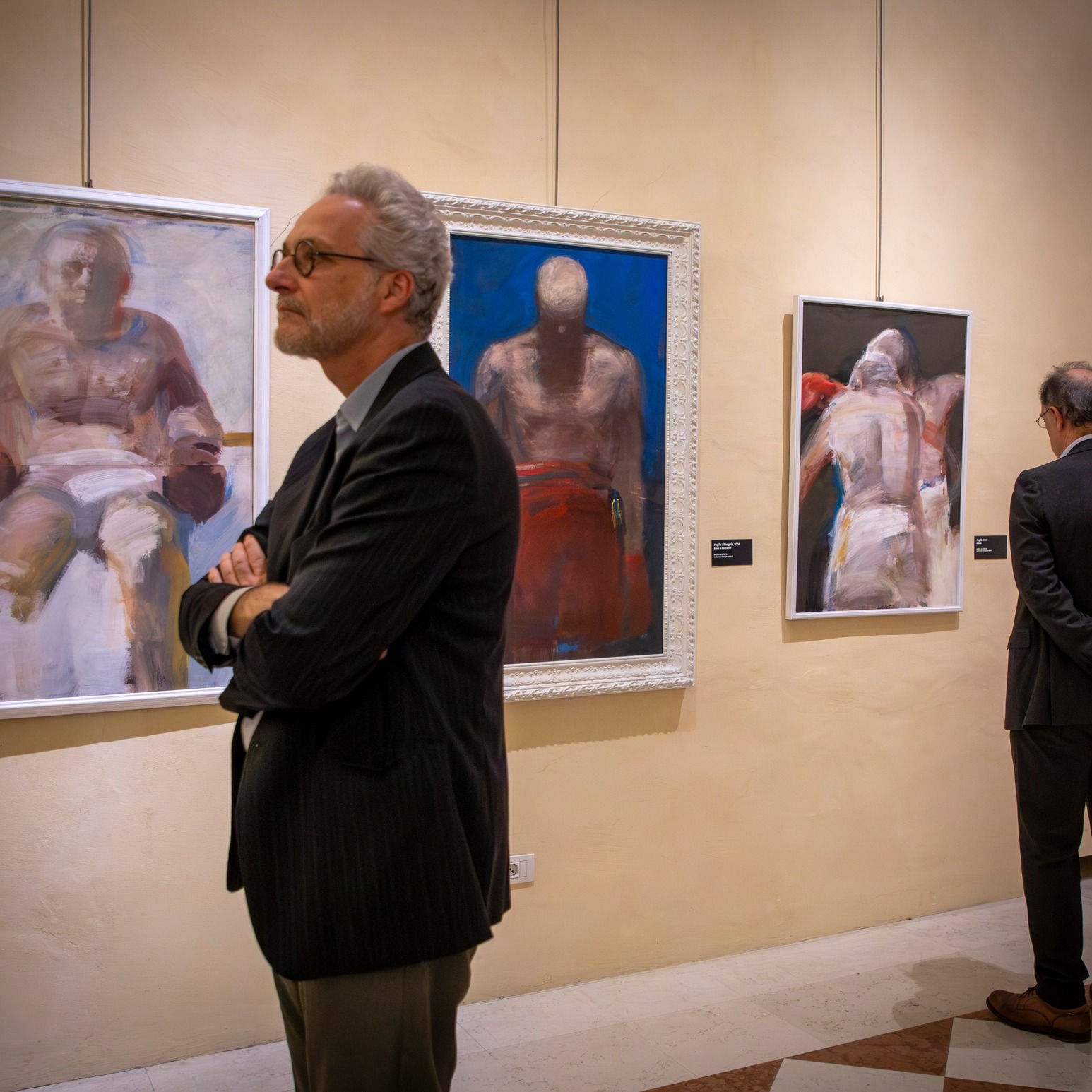 Nella stessa sala i volti tratteggiati degli esordi si affiancano così ai ritratti di pugili realizzati a metà degli anni ’90 con pennellate espressioniste e reminiscenti delle forme, doloranti e deformanti, di Francis Bacon. La carrellata include una delle rappresentazioni di Icaro, riletto negli anni 2000 come emblema dell’uomo – spiega Enrica – inchiodato con quelle grandi ali alla sua croce, ma capace proprio grazie a queste di protendersi verso il cielo.