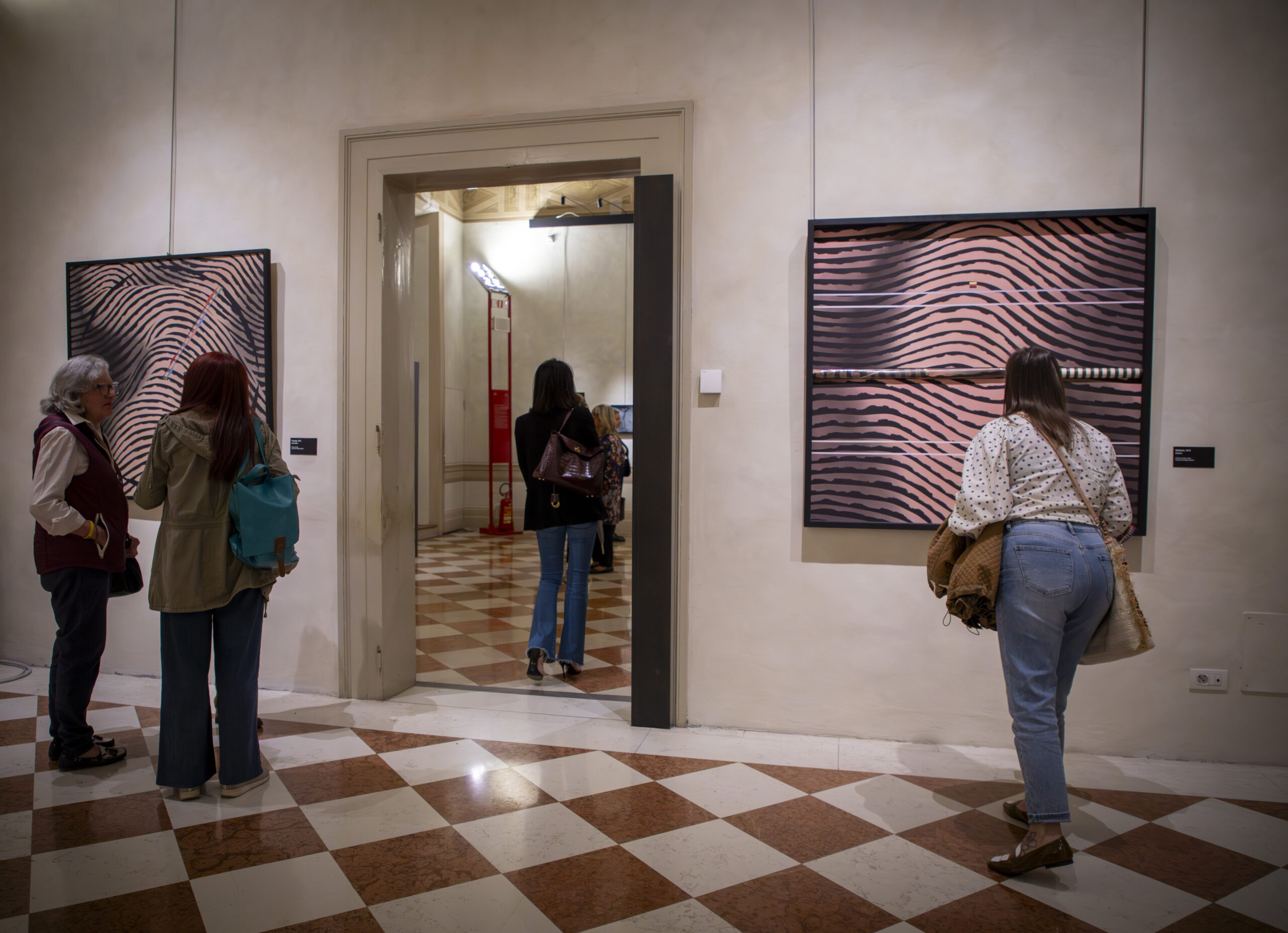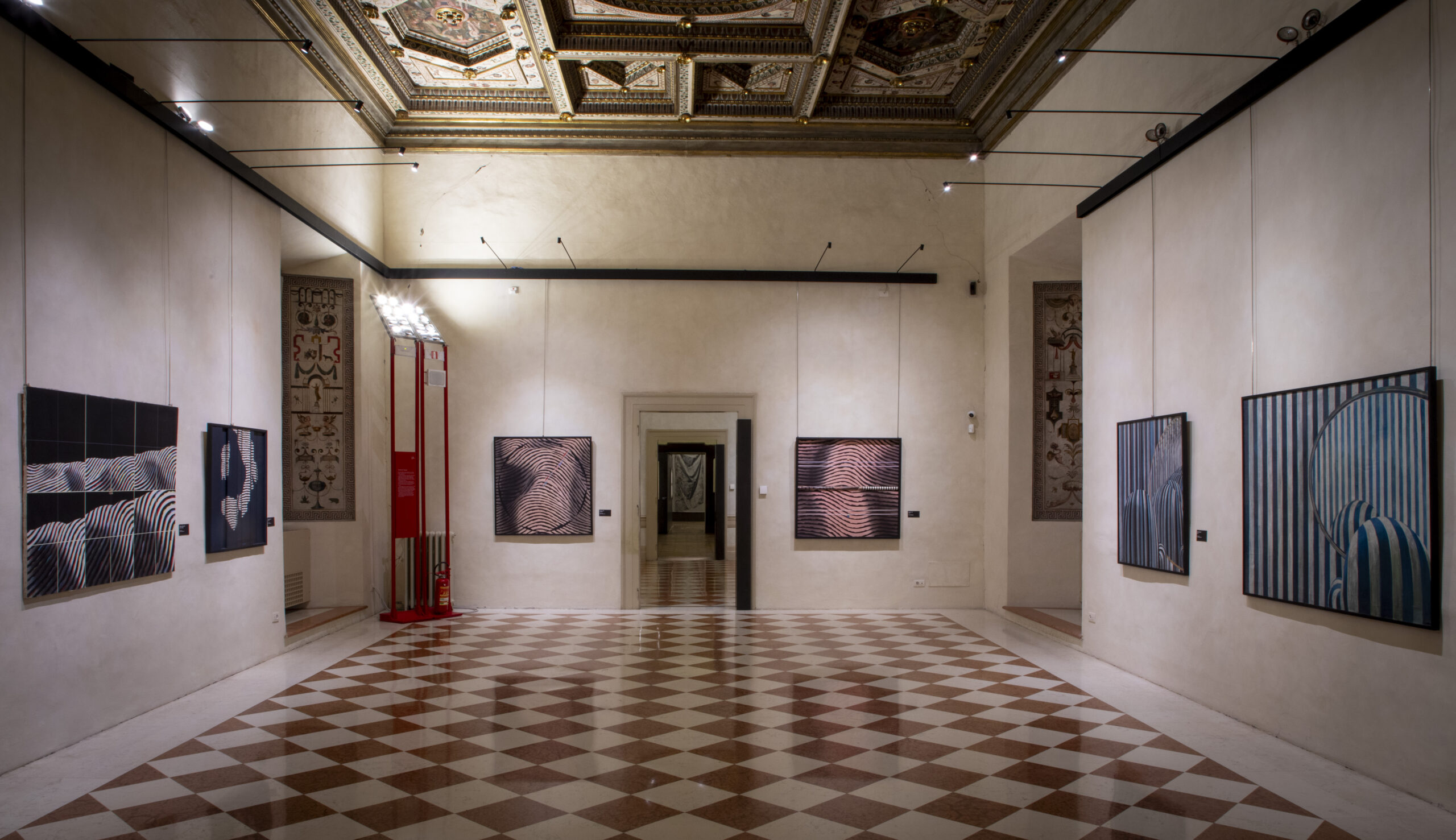 Le righe – Tessuti rigati, ma anche linee e tratti che rimandano alla cartografia geografica sono uno dei temi ricorrenti lungo tutta la carriera artistica di Goberti, che la mostra in Castello raccoglie in un’unica sala. Rigature come scavi dentro al quadro dove si ritrovano reperti – fa notare la mia guida – ma anche segnale di allerta, come ben analizzato dallo storico Michel Pastoureau. Tanti i significati: tratti che mettono in scena una contrapposizione di opposti (il bianco e il nero), ed elemento che dà una sensazione di movimento e accelerazione allo sguardo e, quindi, al pensiero.