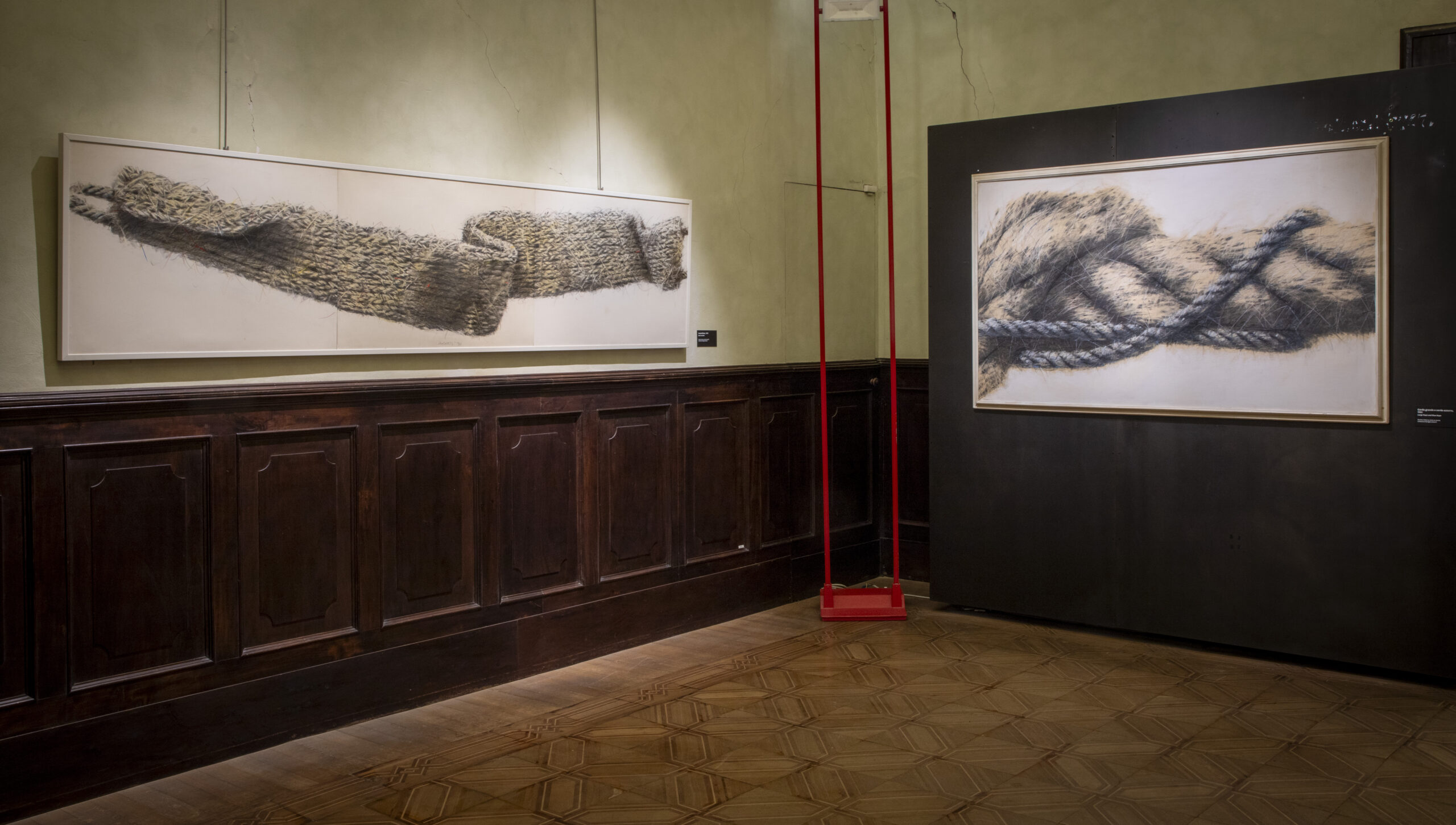 Le corde – Un capitolo a sé è giustamente riservato a lacci e spaghi, così presenti e ricorrenti nella pittura di Goberti. “Corde che stringono, come il tempo perduto”, le ha commentato il docente di filosofia Marco Bertozzi. Corde che diventano anche banco di prova di una pittura descrittiva e dettagliata fin quasi allo spasimo, dove viene inserito a bell’apposta l’errore di proiezione di ombre, la cancellatura, il graffio di colore, il collage (e il finto collage riprodotto ad arte) per conferire al quadro una valenza simbolica e una suggestione tutta contemporanea. Corde che ambiscono a trattenere il cielo. Ancora una volta quindi, il vero insieme con il falso, l’inganno che si contrappone alla veridicità quasi fotografica del tratto.