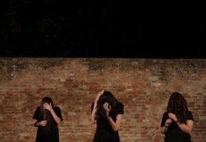 A questo punto entra potentemente in campo il percorso di Michalis Traitsis, esplicitato al pubblico dall’intervento di Domenico Giuseppe Lipani, direttore Centro Teatro Universitario di Ferrara. Un percorso, snodatosi negli ultimi sette anni e che, visto l’amore per la cultura greca e il teatro classico di Michalis, io definirei socratico. Si parte dal conosci te stesso, con i tuoi limiti e le tue potenzialità, per esprimerti, con umiltà e orgoglio, tendendo verso “l’altro”. La relazione con se stessi e con gli altri nasce nello spazio vuoto del teatro come punto di incontro, lasciando la libertà al “non ancora accaduto” di accadere. Ed accade sempre, affermano gli attori nelle interviste, stupiti di essersi mossi , di aver superato paure e limiti, di aver incontrato altri diversi ed uguali a loro.
