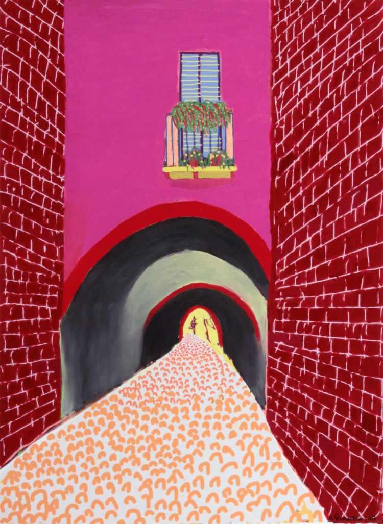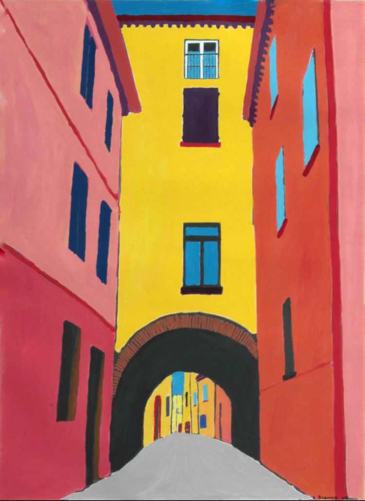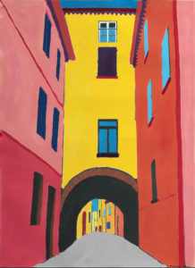 Il rosso del cotto ferrarese diventa un carminio scuro, l’intonacatura rosata si tinge di magenta e l’ocra del palazzo municipale si declina in un’intera palette di colori sul tono del giallo intenso e deciso. Il lavoro dell’artista ferrarese Alessio Primavera punta all’estremizzazione di linee e cromie della sua città, ma anche di altri paesaggi e luoghi, per creare tele in cui i monumenti noti si trasformano in composizioni con una connotazione grafica di forte impatto.