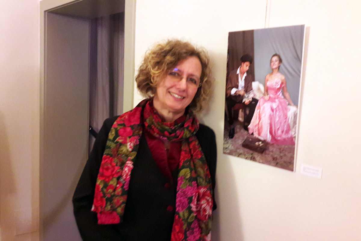 Flavia Franceschini davanti al ritratto della figlia Aurora con Pietro Moretti per la mostra su “Le muse quietanti” (foto Giorgia Mazzotti)