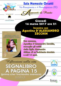 Giovedì 16 marzo alle 21 nella sala Nemesio Orsatti di Pontelagoscuro (via Risorgimento 4) è in programma un nuovo appuntamento con la letteratura e i sentimenti. All’incontro, inserito nel salotto letterario “Appunti di Ponte”, curato da Gabriele Botti e organizzato da Pro loco Pontelagoscuro con il patrocinio del Comune di Ferrara, partecipa Agostina D’Alessandro Zecchin, mamma di Alessandra Zecchin, ragazza di 15 anni giovanissima vittima di un incidente stradale.
