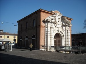 Un intervento della fine degli anni 80 del 900, per la riqualificazione della Via Bologna, ha messo in evidenza l’originaria quota di imposta della porta in pietra d’Istria, progettata e costruita dall’Aleotti, che si poneva circa a metri 1,50 sotto alla quota attuale di Piazza Travaglio.
