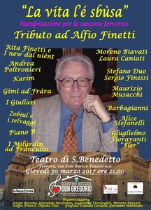 È diventato noto all’inizio degli anni ’70, ha scritto circa duecento canzoni in dialetto ferrarese, pubblicato venti album. E poi la sua passione per la Spal, per la quale ha scritto un brano che ne è divenuto inno ufficiale. Sarà un vero e proprio ‘Tributo ad Alfio Finetti’ e alla sua vasta produzione da parte di tanti musicisti legati al panorama locale e non solo, oltre che una vera occasione per i suoi fan, la manifestazione dal titolo “La vita le sbùsa” in programma giovedì 30 marzo alle 21 al teatro San Benedetto (via don Tazzoli 11).
