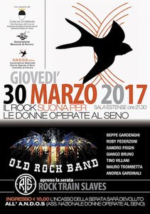 Giovedì 30 marzo 2017 alle 21 alla sala Estense di Ferrara, “Il Rock suona per le donne operate al seno”; il concerto è organizzato da Andos (Associazione nazionale donne operate al seno) comitato di Ferrara in collaborazione con l’Associazione musicisti di Ferrara.