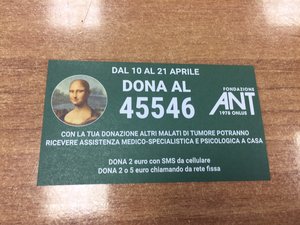 >> Inoltre dal 10 al 21 aprile sarà possibile donare 2 euro da ANT con l’SMS solidale al n. 45546. Chiamando da rete fissa si possono donare 2 euro oppure 5 euro. Un piccolo contributo a favore di ANT che può fare grandi cose.