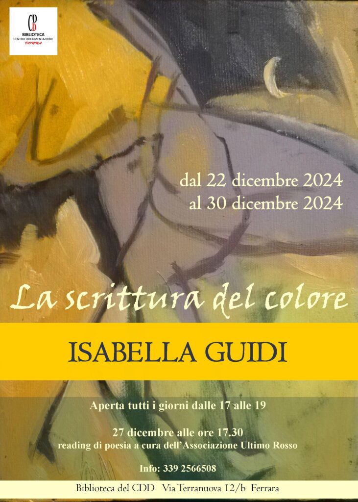Dal 22 al 30 dicembre 2024 la pittrice Isabella Guidi esporrà la sua raccolta di opere pittoriche dedicate ai colori della natura ed accompagnate da brevi testi poetici che l’autrice ha scritto e ai quali si è ispirata per realizzare i quadri.
