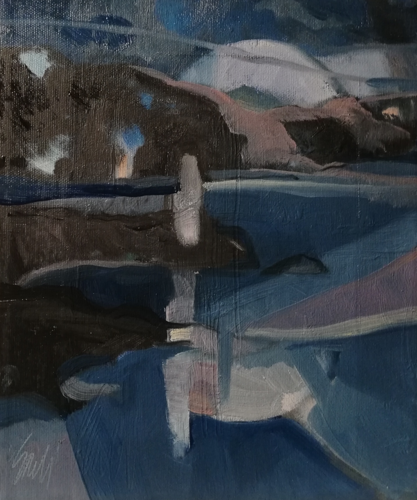 Lo spettatore viene condotto, quasi sospinto, ad una riflessione che va oltre le immagini, toccando ora momenti sofferti, come di fronte ai quadri che parlano della violenza della guerra o di quella subita dall’ambiente, a volte elegiaci nell’immergersi in acque cristalline di oniriche baie marine o fluviali nel luccicante cielo notturno. La luce lunare esercita sull’autrice un profondo fascino, tanto che la maggior parte delle opere esposte sono state realizzate proprio a partire dall’atmosfera notturna a lei così cara.