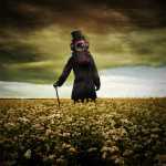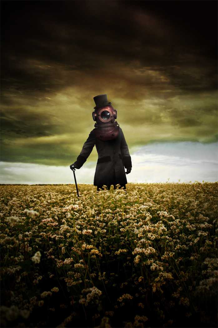 Armoniose ballerine ingessate nei tutù neri in attitudes su rocce nere; impeccabili donne-tailleur nascoste da maschere antigas e musi di animali senza vita; figure femminili fuse in bicchieri di latte o spente in una nuvola fumo, come sigarette tristi, inverni nucleari alla Gia Carangi, grotteschi manichini in abito da sera si fanno ammirare da un invisibile pubblico; dame prendono il tè sedute a un tavolino dimenticato. Viandanti con l’unica guida di girandole colorate; eleganti nobiluomini in tuba e bastone che attraversano campi di fiori, o tristi Pierrot compianti persino dall’adorata luna; bimbi sperduti in balìa di navi di carta. Distorte mescolanze tra Bianconigli e malefici Cappellai Matti che ingannano una Alice al di qua non di uno specchio ma di un armadio; gentiluomini nei frac neri prigionieri di spiagge invase da ombrelli abbandonati; violinisti in costumi barocchi intonano melodie statiche, imprigionate su una pagina patinata, che nessuno ascolterà; Forrest Gump con ventiquattrore studiano l’orologio, attendono un autobus che non passerà mai.