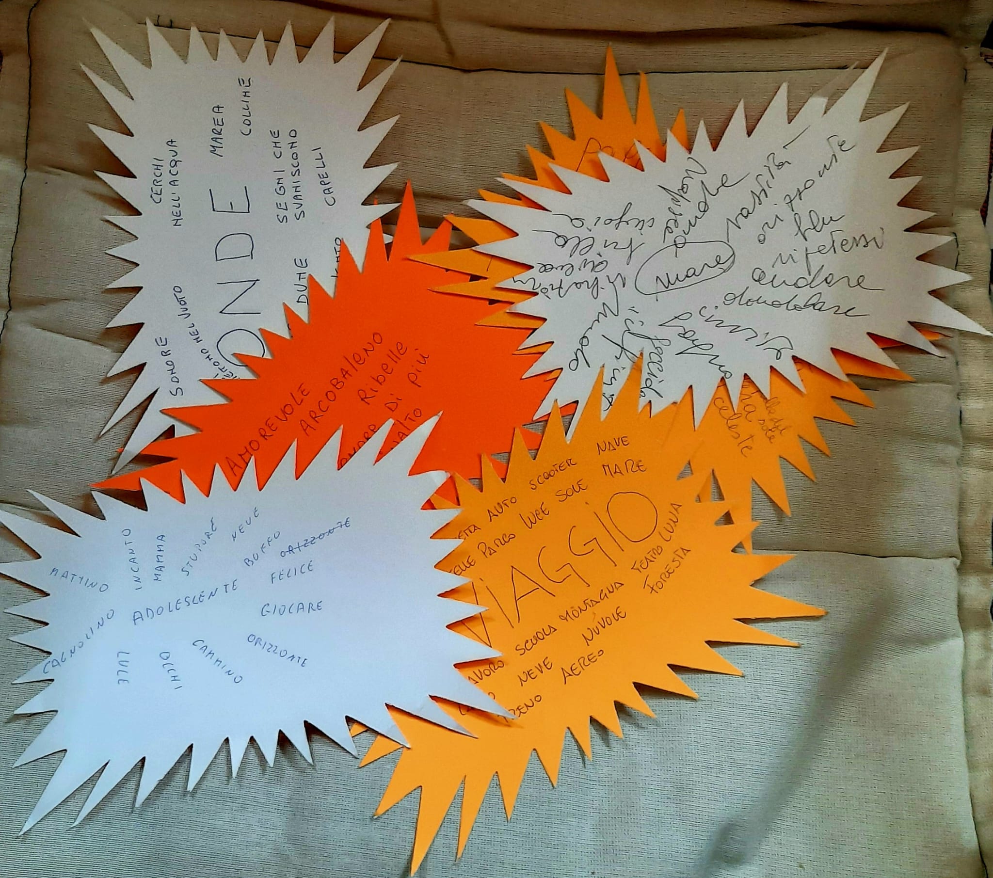 Parole esplose (si compone il campo semantico di una parola-chiave trascritta su un supporto di carta colorata a forma di raggera)