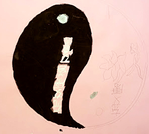 Dopo varie vicissitudini e importanti rotture familiari pare che tu stia trovando un modo di ricucire la tua immagine. Spontaneamente ti dedichi a una sorta di mandala dove motivi floreali orientali si sposano con le iniziali del tuo nome originale. Il rosa è il tuo colore preferito e lo dividi in una campinatura che dovrebbe riproporre, nell’insieme, il simbolo dello Yin e dello Yang. Ma sei insoddisfatto, si avverte un senso di riluttanza, lo si percepisce anche dalla confusione dell’immagine, dal disordine e dall’approssimazione. Lascerai il lavoro incompiuto e deciderai di interrompere la terapia.