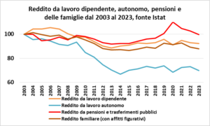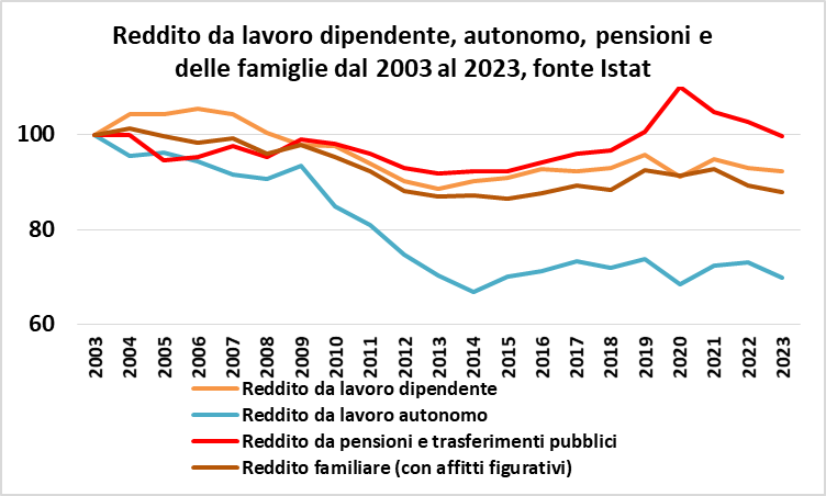 La forte crescita dell’occupazione in Italia dopo il 2021, proprio a causa dei bassi salari, non riesce ad aumentare il reddito netto reale delle famiglie che è infatti sceso da valore 92 del 2019 a 88 nel 2023 (fatto=100 il 2003) e scende anche dal 2022 al 2023, come si può notare dalla figura. (https://www.istat.it/comunicato-stampa/condizioni-di-vita-e-reddito-delle-famiglie-anni-2023-e-2024/)