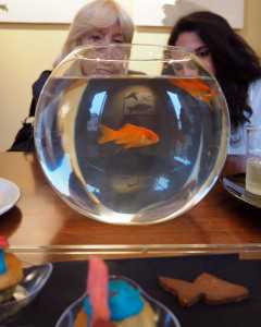 L’opera di Camerani “Oceano” con davanti i pesci fluttuanti alla Maria Livia Brunelli home gallery di Ferrara fino a settembre 2014