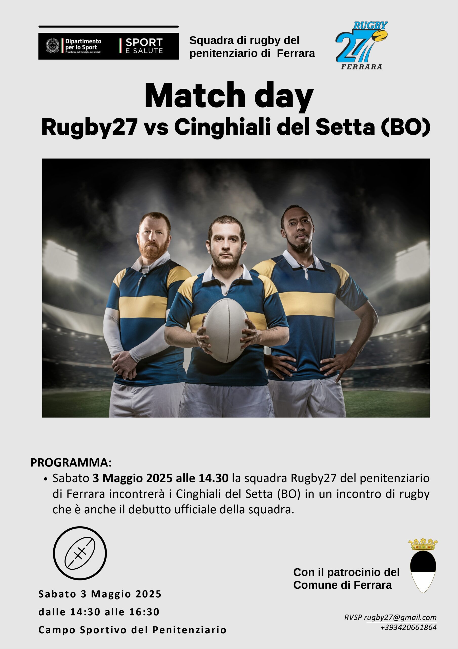 Proprio nell’ambito di questo progetto, sabato 3 maggio 2025, nel campo sportivo della Casa Circondariale di via Arginone, è avvenuto il debutto ufficiale della squadra Rugby27, i cui giocatori sono ragazzi detenuti nel carcere di Ferrara, che ha incontrato i Cinghiali del Setta di Bologna.