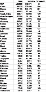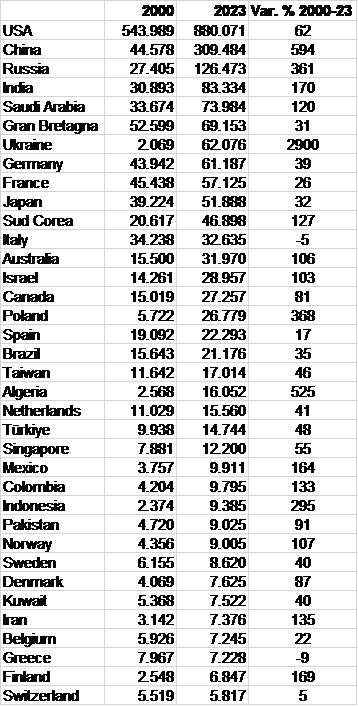 Spesa militare nei primi 36 paesi (94% del totale mondiale, pari a 2.400 miliardi) nel 2000 e 2023, milioni di dollari a prezzi costanti 2022