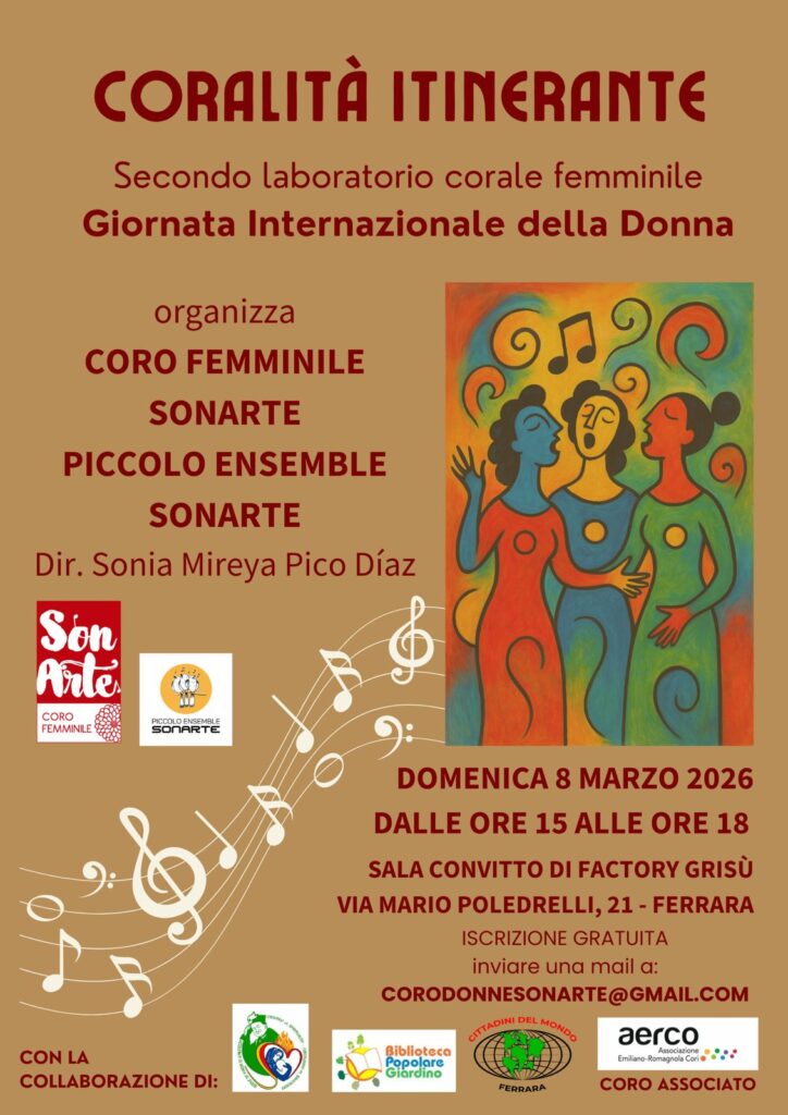 Il laboratorio è parte integrante di un progetto che Sonarte ha intitolato CORALITÀ ITINERANTE, tre laboratori rivolti prevalentemente alle donne e ai ragazzi e alle ragazze delle scuole secondarie di primo e secondo grado. È previsto anche il coinvolgimento di alcune associazioni di volontariato che operano nel territorio ferrarese per l’inserimento e l’integrazione delle donne straniere.
