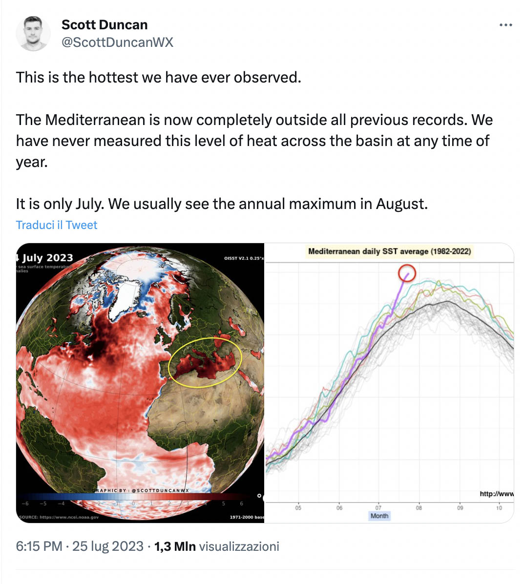 E poi ci sono i mari e gli oceani. Ovvero la maggior parte della superficie terrestre, anche se molto spesso ce ne dimentichiamo solo perché viviamo sulla terraferma. In questi giorni, infatti, il Mediterraneo è stato descritto come un mare in ebollizione, con temperature da vasca da bagno più che da mare aperto. Temperature mai viste prima: la mediana giornaliera ha raggiunto i 28,71 gradi centigradi. Un dato che ha spinto il meteorologo scozzese Scott Duncan, diventato popolare sui social per le sue coperture precise e costanti, a scrivere in un tweet (si chiamano ancora così?) che “il Mediterraneo è ora fuori da ogni misurazione fatta fin qui. Non abbiamo mai misurato questo livello di calore nel bacino mediterraneo in qualsiasi periodo dell’anno. Ed è solo luglio. Di solito il picco viene raggiunto in agosto”.