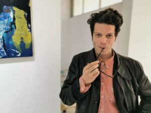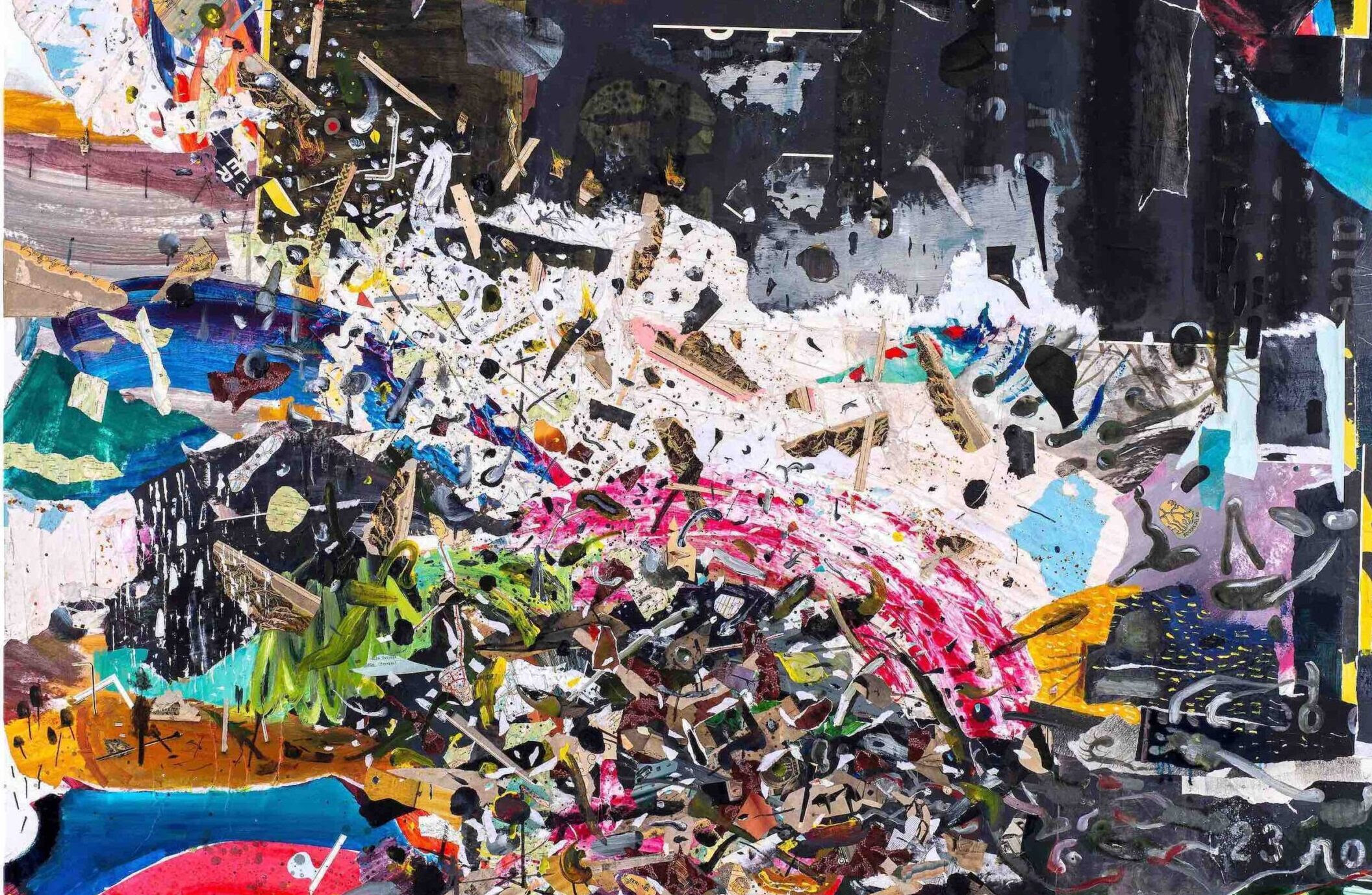 La seconda sala espone le opere di Luca Zarattini composte di carte strappate e macchie di colore che, a un’osservazione più attenta e ravvicinata, rivelano un tuffatore nell’atto di fendere la superficie acquatica.