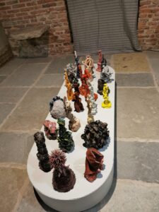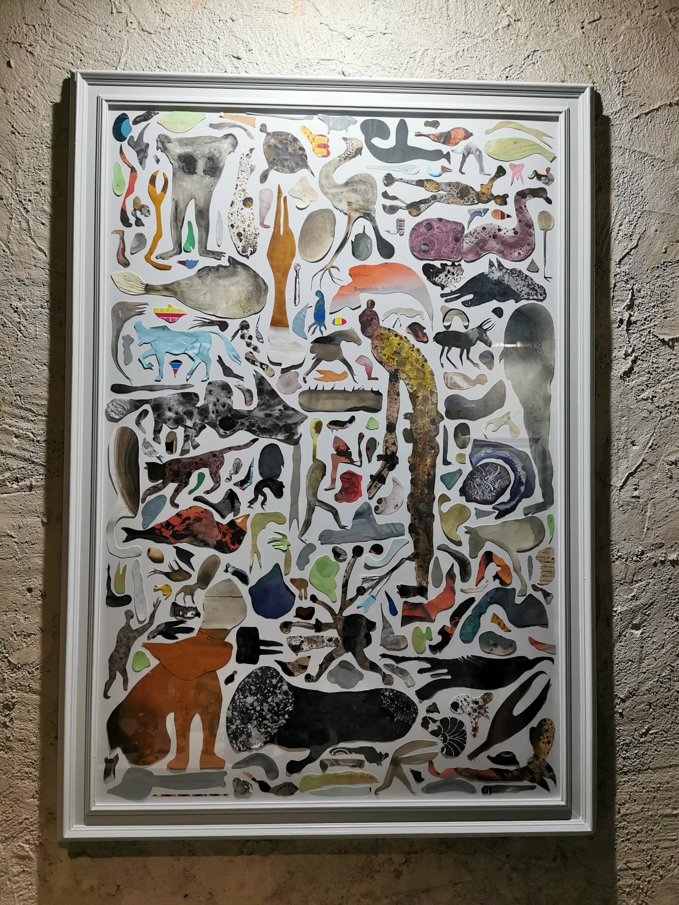 Passando nell’ultimo spazio, la sala-grotta sempre all’interno delle Scuderie, esplode l’universo delle creature rigenerate in un mondo nuovo, che riparte dai fondali oceanici. Molto belle le ceramiche realizzate da Zarattini, che plasmano sedimentazioni marine dalle forme e colorazioni diverse: ci sono quelle violacee come rocce incrostate di cozze, appuntiti ricci purpurei, colonne di varie tonalità che evocano formazioni calcaree di stalagmiti. Ai suoi lati campeggiano i due grandi lavori su carta di DeRiva, che recupera i suoi molteplici animali ritagliati e scartati nella realizzazione di altre opere, abbinandoli uno accanto all’altro come su una teca di un raccoglitore di farfalle o alla maniera di un puzzle che evoca gli incastri di animali del designer Enzo Mari.