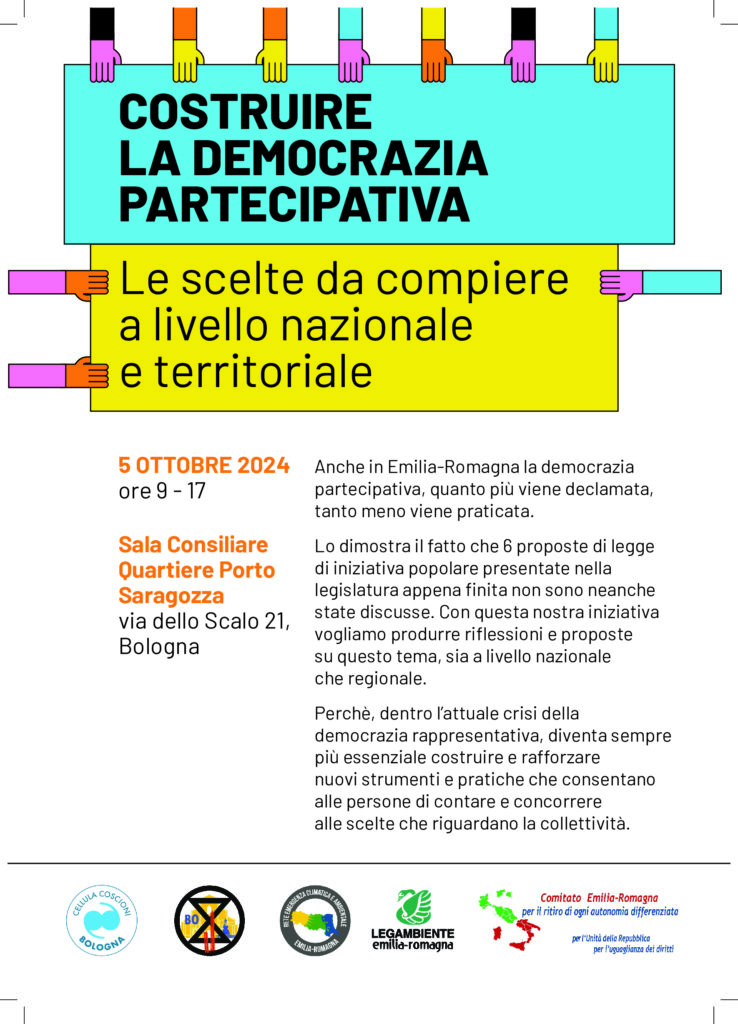 Questo fa emergere anche un problema di democrazia, e, in particolare, di quelle forme che prevedono l’attivazione diretta delle persone e dei soggetti sociali operanti nel territorio e che ha spinto le realtà che, in questi anni, si sono cimentate in questi percorsi a promuovere un importante momento di riflessione e proposte il 5 ottobre a Bologna (vedi sotto programma definitivo)