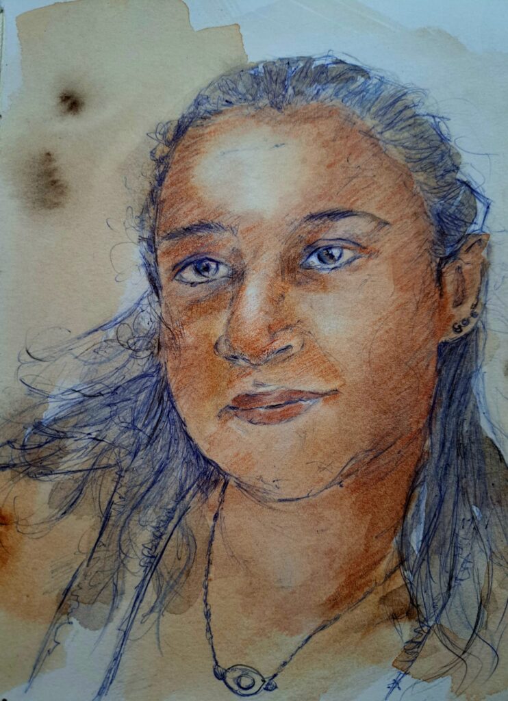 Ritratti di Miriam Cariani – tecnica penna e acquarello su carta. Tutti i diritti riservati.