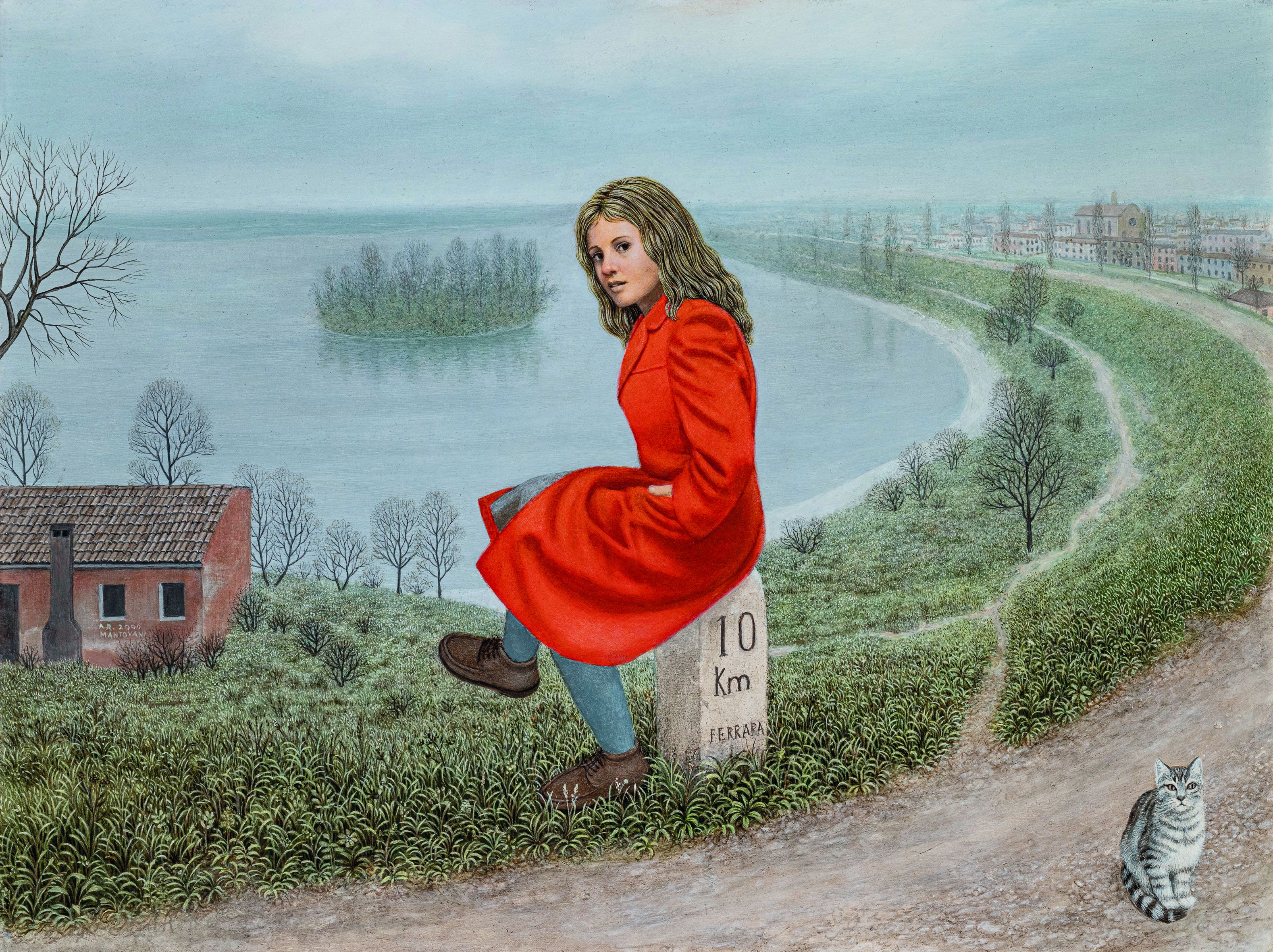 Il Paletot rosso, del 2006, che è stata scelta per la locandina della nostra e la copertina del suo catalogo, rappresenta, invece, una scena del racconto Trefossi dell’artista. Mariagrazia è seduta su un paracarro lungo l’alberato argine del Po, in un’ambientazione tipicamente padana: una nebbiosa e malinconica giornata invernale. Con il suo paletot rosso fiammante la si riconosce facilmente da lontano, nonostante la foschia. La chiamano la pazza del paese, attende qualcuno ma non si sa chi, non lo sa nemmeno lei. Quando vede l’amico Angelo arrivare con il motocarro, lo ferma perché forse vuole un passaggio per recarsi a Ferrara, nessuno sa per fare cosa. Una ragazza piena di misteri. Va in città o altrove? E perché mai? Angelo la prende con sé, è la sua preferita, non la considera matta, ma solo disorientata, incapace di gestire la prioria vita. Anche a noi piace immaginarla così. Tra serenità, candore, nostalgia, speranza e un poco di giovanile inquietudine.