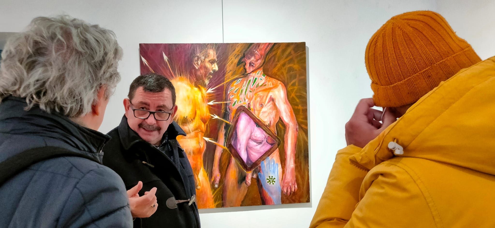 Uno degli autori esposti, Alessandro Medori, romano, titola la sua opera proprio “San Sebastiano e il demone del Covid”[nella foto in alto]. La raccolta – spiega Scardino – è il frutto di oltre un decennio di ricerca estetica e figurativa, che ha preso forma negli anni attraverso un centinaio di autori.