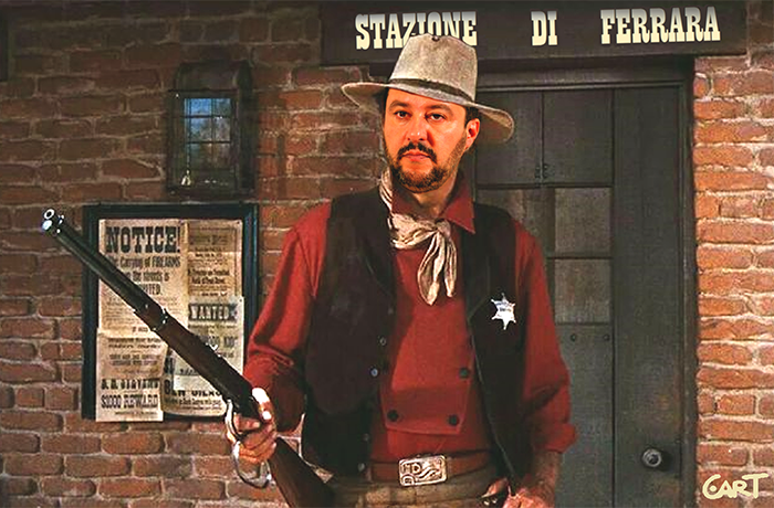Tutte le volte che incontro il ministro Salvini – e lo incontro almeno 20 volte al giorno, data la sua sapienza a materializzarsi in qualsivoglia media. Tutte le volte che lo vedo – e lo riconosco all’istante, anche se lui cerca di disorientarmi cambiandosi la felpa e travestendosi da sceriffo, poliziotto, militare, pompiere, militante di Casa Pound o volontario della protezione civile. Tutte le volte che lo ascolto parlare – usando carezze e promesse, minacce o avvertimenti – mi viene in mente il Vecchio West .