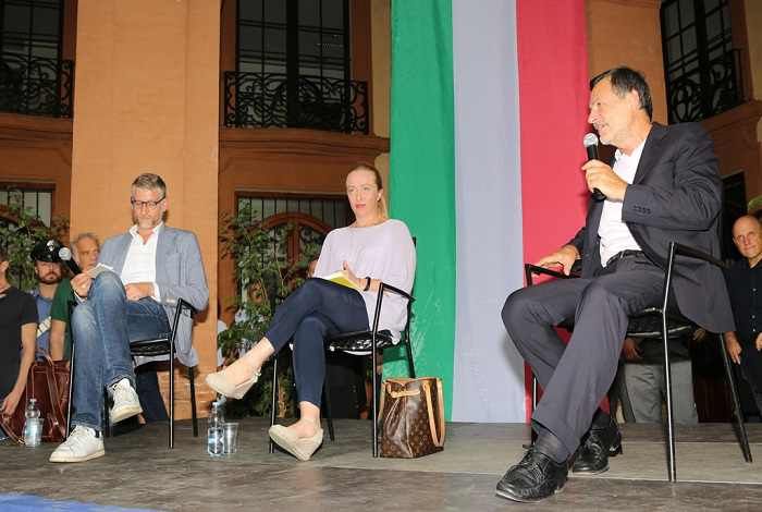 Il secondo blocco di interventi ha visto come protagonisti Anna Maria Bernini, capogruppo di Forza Italia al Senato, Gianluca Vinci, coordinatore regionale della Lega e Tommaso Foti, coordinatore regionale di Fratelli d’Italia. Anche qui la scelta di fondo è stata ostentare la coesione nelle differenze, come hanno detto gli ospiti. La particolarità di questo dibattito, dal titolo “C’erano una volta le regioni rosse” è stata la presenza del giornalista Stefano Lolli nelle vesti di intervistatore insieme ad un collega. Proprio Lolli, giornalista del Resto del Carlino, era stato di recente protagonista di una piccola ma significativa vicenda, avvenuta quando, durante una diretta social insieme all’assessore Modonesi, si ironizzava su una manifestazione nella quale le associazioni Gad Sicura ed Insorgenti riaccendevano i riflettori sul caso “Siberiana”. La particolarità sta proprio nel fatto che proprio gli Insorgenti sono stati tra gli invitati della Festa del Tricolore – infatti la parte conclusiva era riservata alla visione del loro film “Mi chiamo Ida” – e non sono mancati i mugugni all’insegna del moderatore Lolli per la sua presunta “vicinanza” con l’amministrazione targata Pd. Dopo questo siparietto, è arrivato il turno dell’ospite d’onore della giornata. Alle ore 17 e 50 infatti è arrivata Giorgia Meloni. L’accoglienza è stata quella delle grandi occasioni e il suo intervento è stato interrotto più volte dagli applausi. Da notare, però, che il suo arrivo ed il suo discorso ha visto la ‘scomparsa’ dei rappresentanti, tra il pubblico, degli altri due partiti del centrodestra. Aspetto da non sottovalutare.