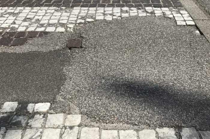 W il bitume, in città è di gran moda… Le nostre strade – fisiche e mentali – sono zeppe di buoni propositi e zuppe di rappezzi, come nel caso del crocicchio di via Putinati (come di molte altre vie cittadine): quando i sampietrini (posati in un raro dì di neuroni attivi per conferire un tocco di eleganza alla zona) si deteriorano, ecco in azione gli artisti del rappezzo e i loro mandanti: rattoppano badando al sodo. Altroché poesie…