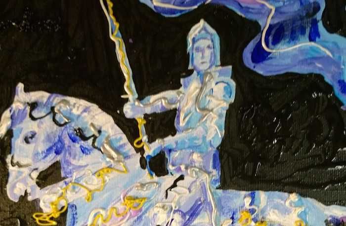 In un percorso che ricorda la sua attività di pittrice di scena nel film “I Cavalieri che fecero l’impresa” di Pupi Avati, l’esposizione presenta un suggestivo paravento-scenografico che esalta i tre poeti ferraresi: Boiardo, Ariosto e Tasso. Le ultime opere di Maria Paola hanno abbandonato le sue calme evocazioni medievali o quelle miniaturistiche, che facevano parte del suo vissuto, per dar posto solo al colore, che assume un significato aggressivo, d’origine quasi fauve. Il colore diventa segno, espressione, vive in un ambiente naturale sconvolto da un immane cataclisma, di battaglie, di duelli e passioni e che distorce le bordature laterali dello spazio, piega i cieli e la natura circostante. Non è una forzatura. Annullare le leggi fisiche della forza di gravità, annullare gli equilibri di verticali e orizzontali è uno strumento tipicamente della libertà dell’artista per far sentire che le leggi matematiche eterne vivono soltanto al di fuori dell’uomo.