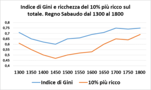 Nel 1300 il 10% più ricco della popolazione urbana del Piemonte deteneva il 61% della ricchezza, che aumentò sino a circa 65% alla vigilia della Peste Nera, più o meno come oggi.