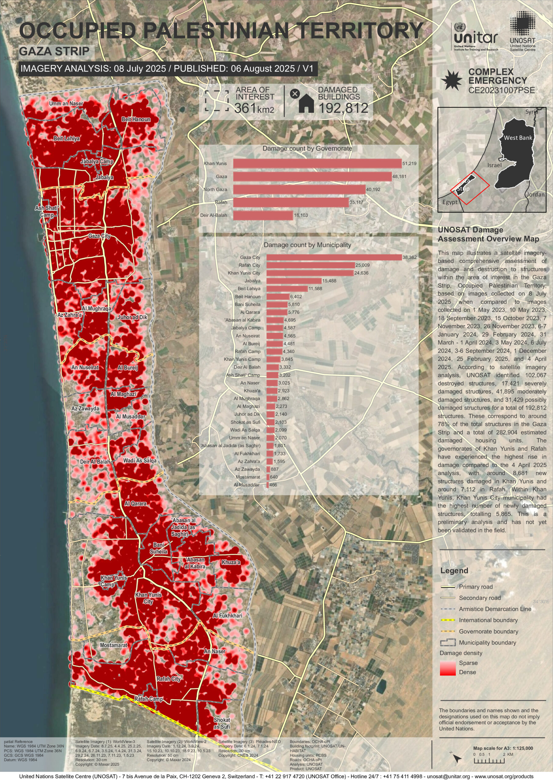 Dal confronto tra immagini satellitare da maggio 2023 ad aprile 2025, UNOSAT ha identificato 102.067 strutture distrutte, 17.421 strutture gravemente danneggiate, 41.895 strutture moderatamente danneggiate e 31.429 strutture potenzialmente danneggiate, per un totale di 192.812 strutture.