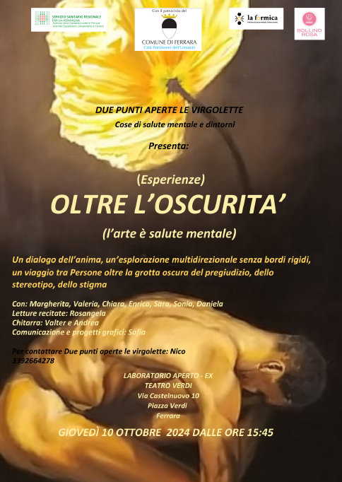 Ho assistito con partecipazione alla presentazione offerta dal gruppo “Due Punti Aperte Le Virgolette: Cose di salute mentale e dintorni”, al Teatro Verdi, giovedì 10 ottobre 2024, nella Giornata Mondiale della Salute Mentale. L’evento è stato promosso dall’Associazione La Formica, dal Servizio Sanitario, dal Comune di Ferrara.
