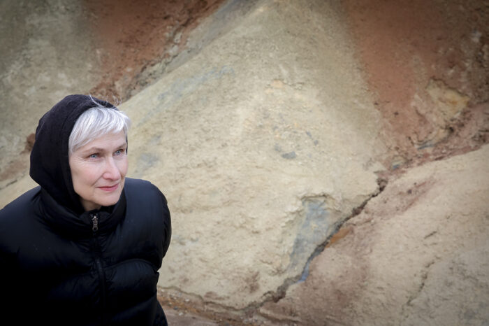 Oltre ad alcune delle sue opere più significative, come la serie in bianco e nero Saltscape, realizzata con sale marino e sale di lava nero, o View, dove domina la lava rossa del vulcano Seyðishólar (sempre un dipinto monocromo ma, a una visione più attenta, si scoprono il caos e l’ordine di cui è capace la natura), la Biennale Donna ospita anche un’altra grande installazione della lava scura che, guardata da lontano assomiglia a un dipinto minimalista, monocromo e austero: tanti puntini neri. Avvicinandosi, invece che pittura, ci si trova di fronte a migliaia di granelli provenienti dal vulcano islandese Heika: su uno strato di colla, l’artista getta a mani nude i residui di lava, alcuni dei quali si attaccano alla superficie, mentre altri cadono a terra. Questi ultimi vengono recuperati e riposizionati con minuziosa attenzione, in un equilibrio casualità/intento che filtra tutto il processo creativo, evidenziando quanto la natura stessa ceda spesso alla fatalità. Qui vedo la forza.