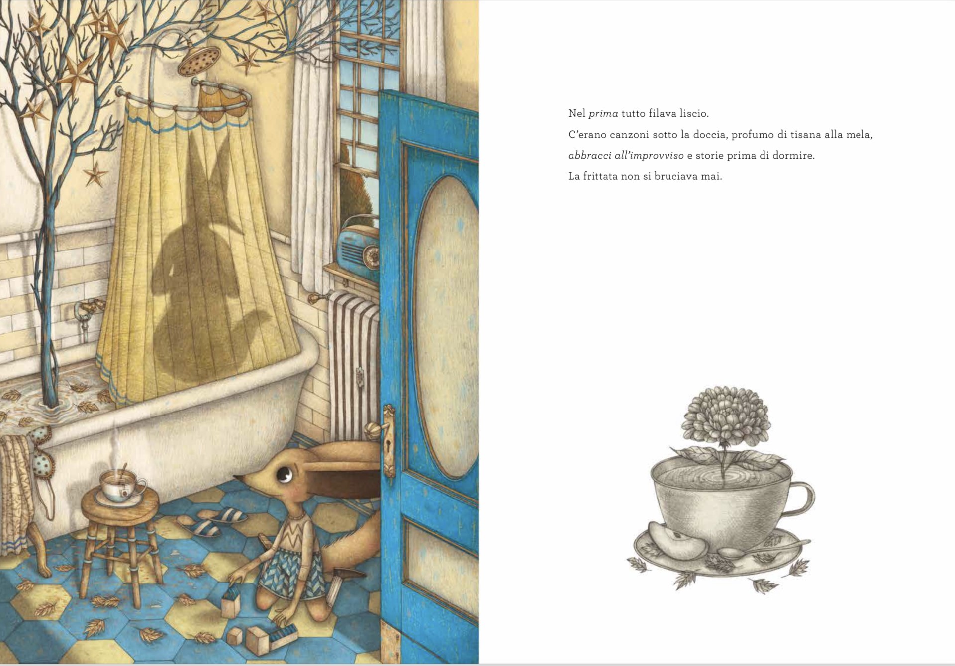 Adesso sono rimasti in due. Ma come si fa ad affrontare una cosa così terribile? Loro non lo sanno davvero. Olivo è piccolo, all’inizio dell’adesso è sempre arrabbiato e disperato, tira calci e rompe cose. Gomitoli di parole tristi si ingarbugliano nel petto. Il respiro manca.