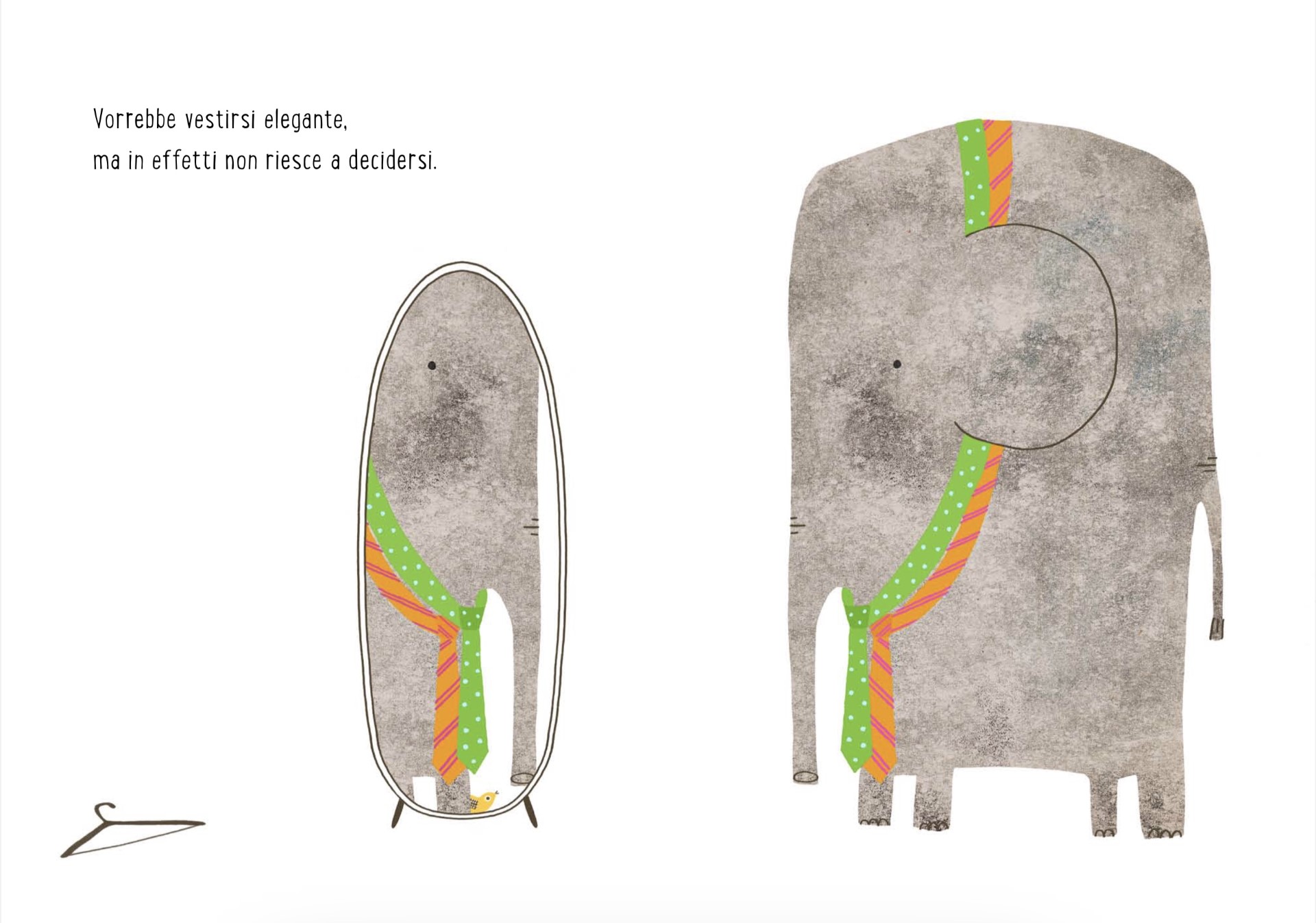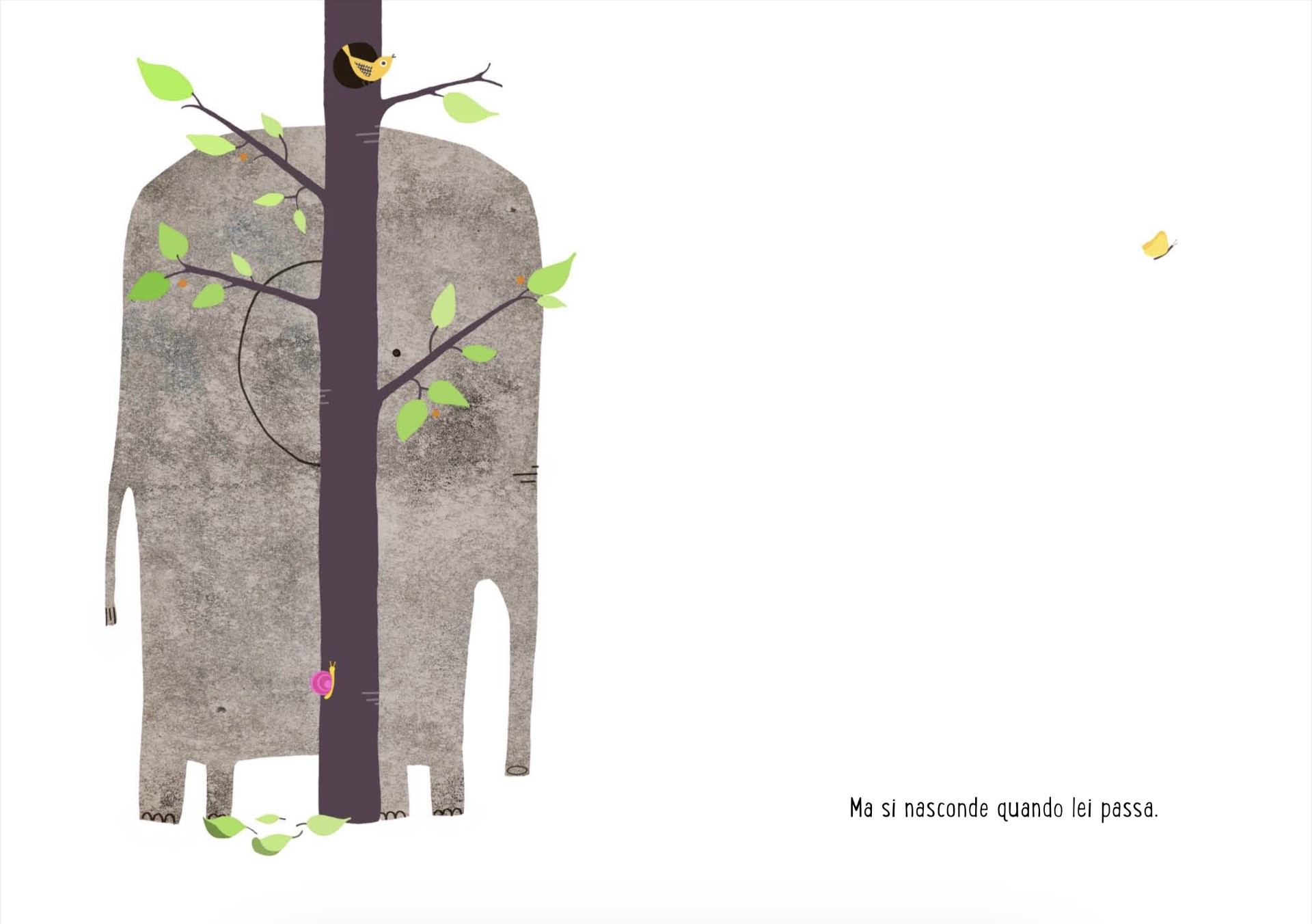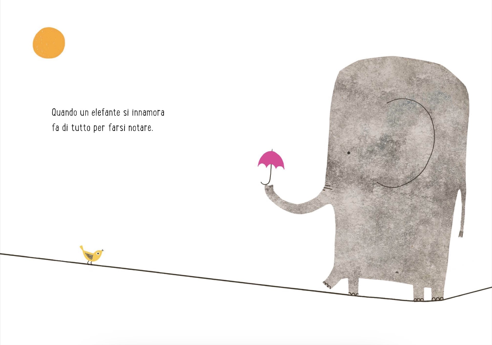Il primo è “Quando un elefante si innamora”, di Davide Calì e Alice Lotti (2014, 32 p.), la storia di un elefante innamorato e molto timido che fa di tutto per attirare l’attenzione della sua amata. Si nasconde quando l’amata passa, dietro un albero (come se bastasse). Decide di seguire alcune regole base, quelle che tutti gli innamorati prima o poi decidono di seguire: si mette a dieta (anche se di notte, qualche volta, si alza per finire la cheesecake, il caro frigo, d’altronde, attende), si veste elegante (fra mille indecisioni), scrive delle lunghe lettere d’amore, guarda le nuvole pensieroso e lascia fiori alla sua porta (scappa subito dopo aver suonato il campanello). Ah, se almeno lei sapesse che esiste. Malgrado tutte queste attenzioni lei non sembra notarlo…. Tuttavia…
