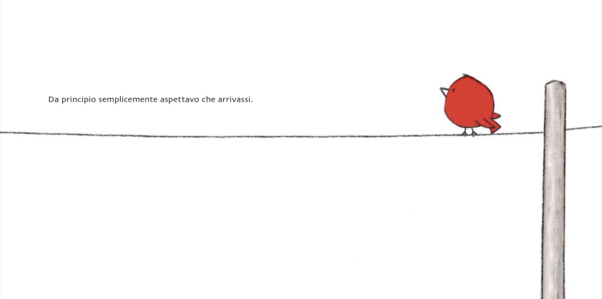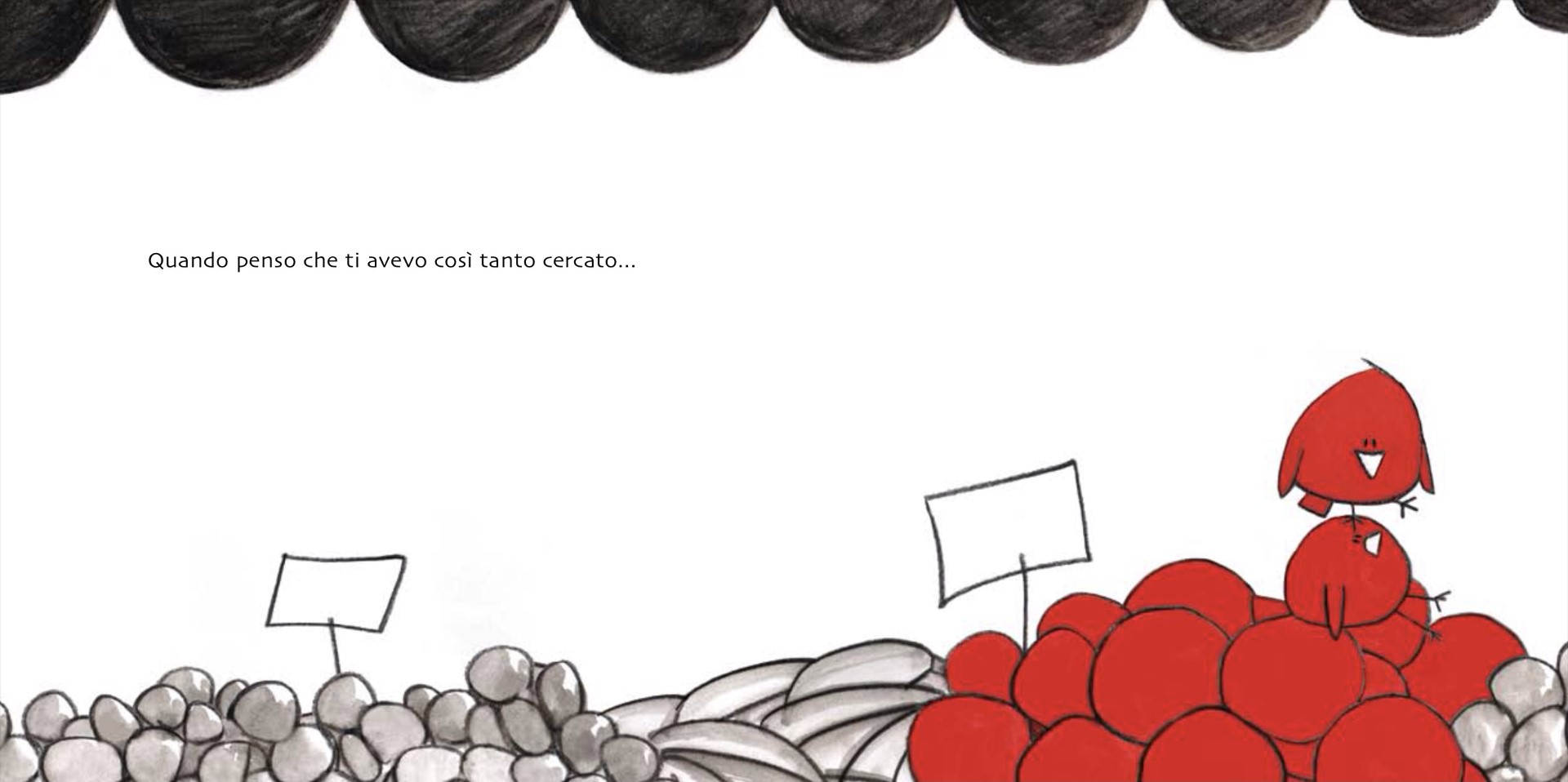 Dall’elefante all’uccellino. “Rosso come l’amore” di Valentina Mai (2018, 32 p.) è magnifico: dalla casa editrice ci dicono che glielo lo ordinano a colpi di cinquanta copie come bomboniera per i matrimoni. In queste pagine Rosso è un uccellino paffutello che vorrebbe trovare l’amore, lo ha sempre solo atteso, vedendolo però ovunque, ma l’impresa si dimostra molto più ardua di ciò che avrebbe creduto, perché quelli che gli paiono suoi simili, sono, in realtà, altre cose: un semaforo, un sole, una sua immagine nello specchio. Quando, sconsolato dalle sue mille avventure mai a lieto fine, comincia a dubitare che l’amore esista o che lui lo possa trovare, eccolo che invece arriva… Mai disperare, saper attendere oltre che vedere e capire, guardandosi dentro. Sempre. Non solo in amore.
