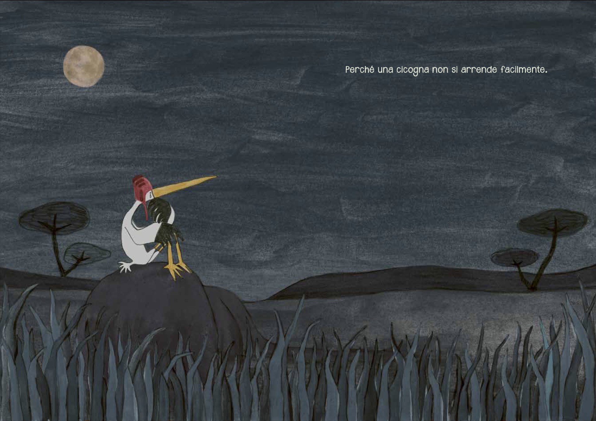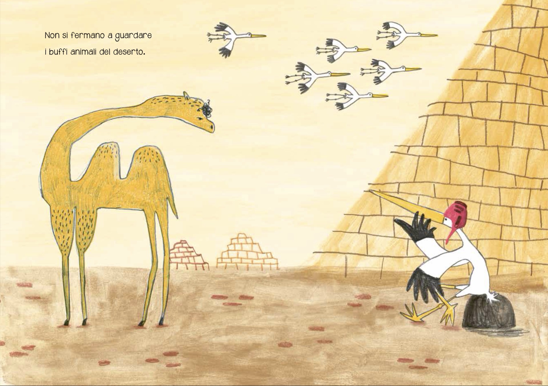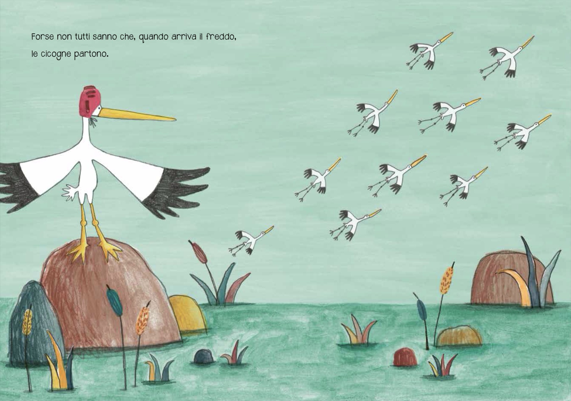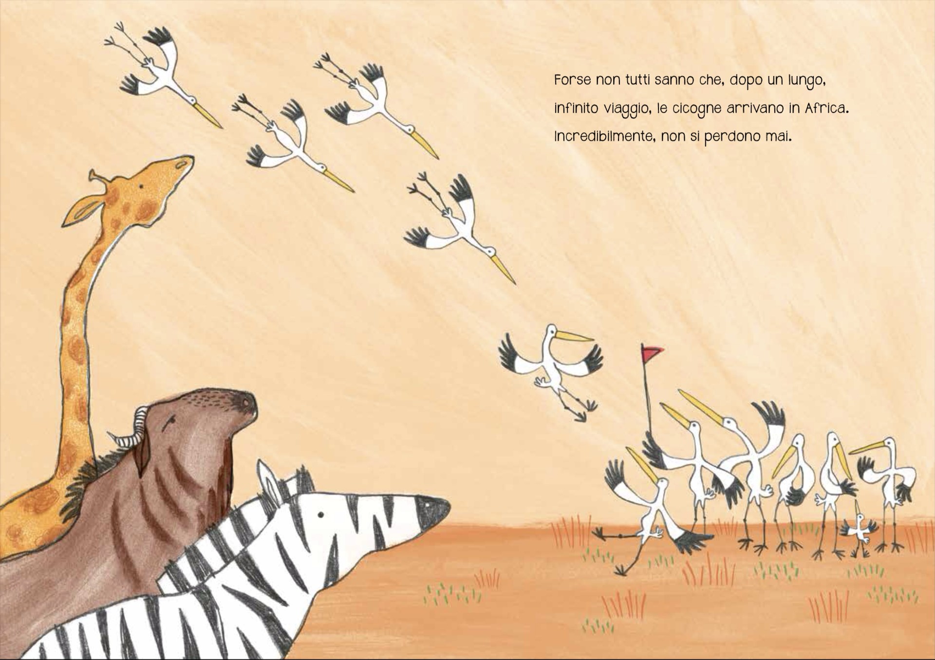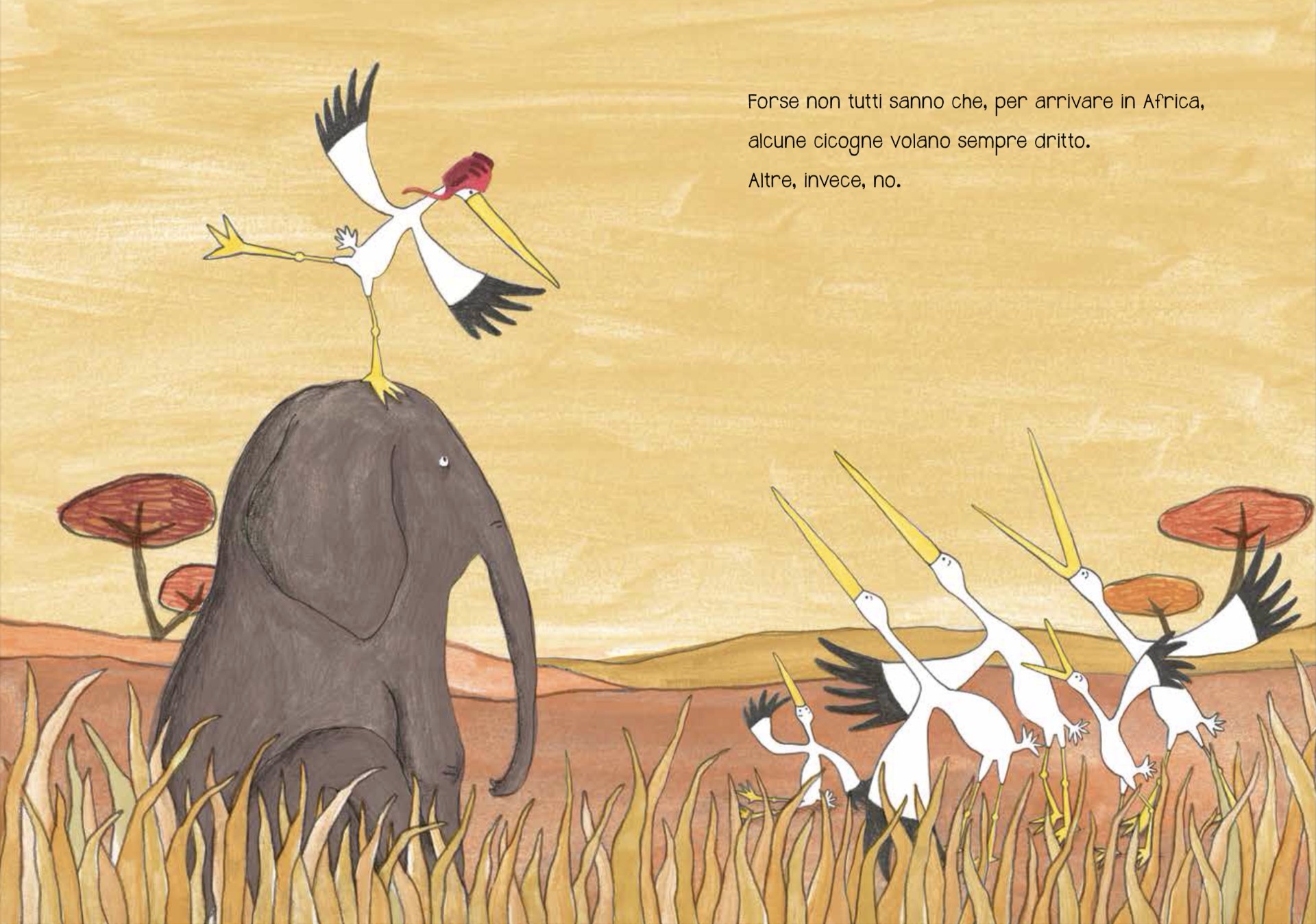 Se fa freddo, la cicogna parte, attraversa il mare per giorni e giorni. Sempre dritto, senza distrarsi, senza giocare con le nuvole, senza chiacchierare con le rondini, senza fermarsi a guardare i buffi animali del deserto. Senza perdersi. O quasi, perché se, per caso, perde la strada, la ritrova immediatamente. Riconoscendo gli animali giusti a cui chiedere.