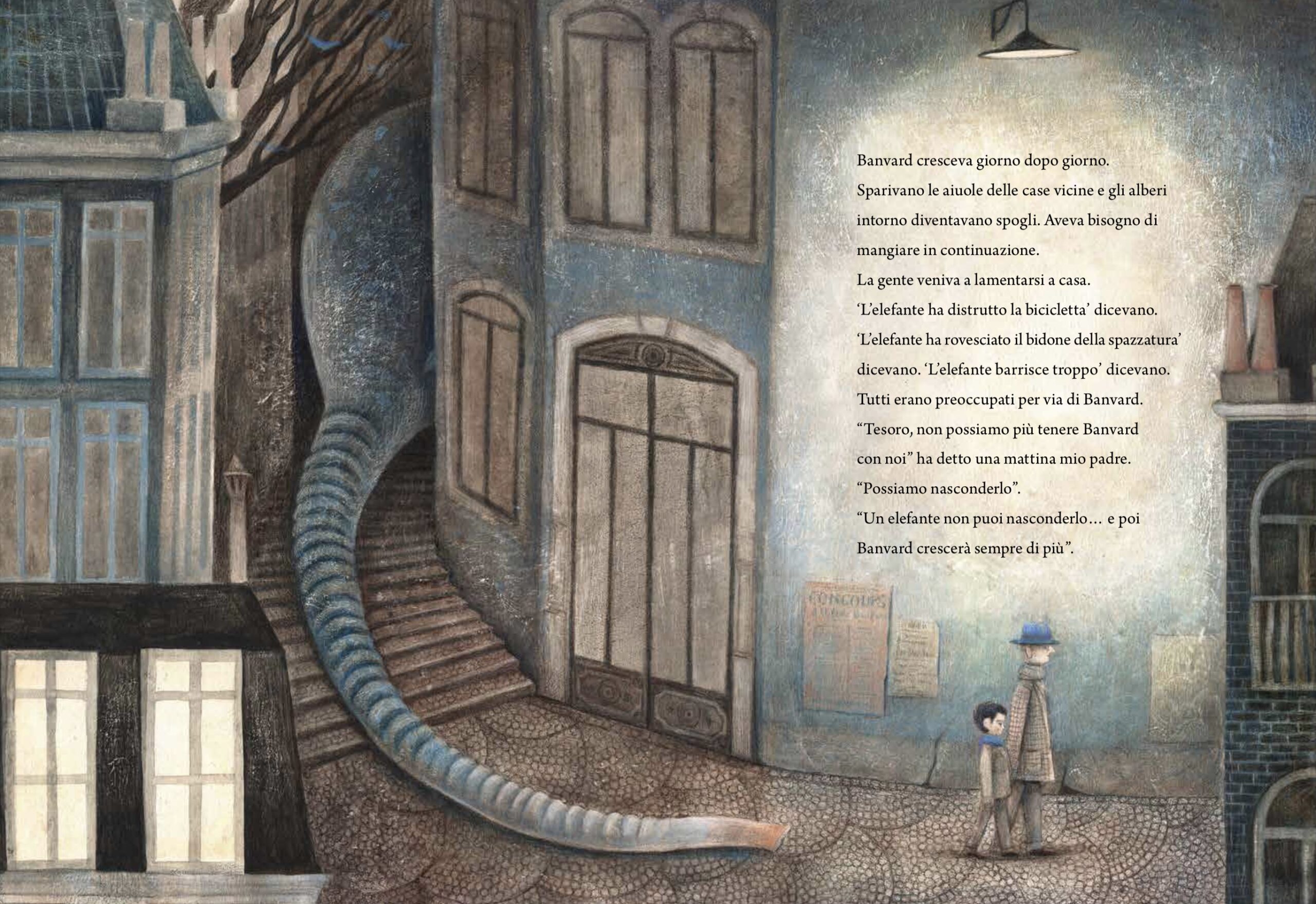 Dicevamo: i sogni, si sa, più grandi sono meglio è. Qualunque essi siano. E il sogno del bambino di questo albo è davvero grandissimo, perché è un elefante. Lui ci pensa, pensa solo all’elefante, vede elefanti ovunque e più ci pensa, più è felice.