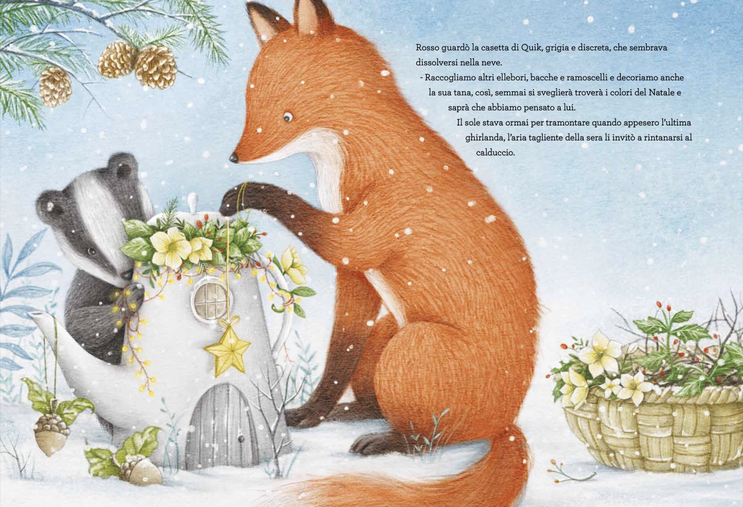 Ecco allora la storia di Rosso Bel Pelo e Bas che, nel bosco addormentato, trascorrono le giornate rincorrendosi sulla neve. Raccolgono bacche e ramoscelli per colorare l’inverno, ma il pensiero corre sempre a Quik, il loro amico ghiro, immerso nel suo lungo letargo.