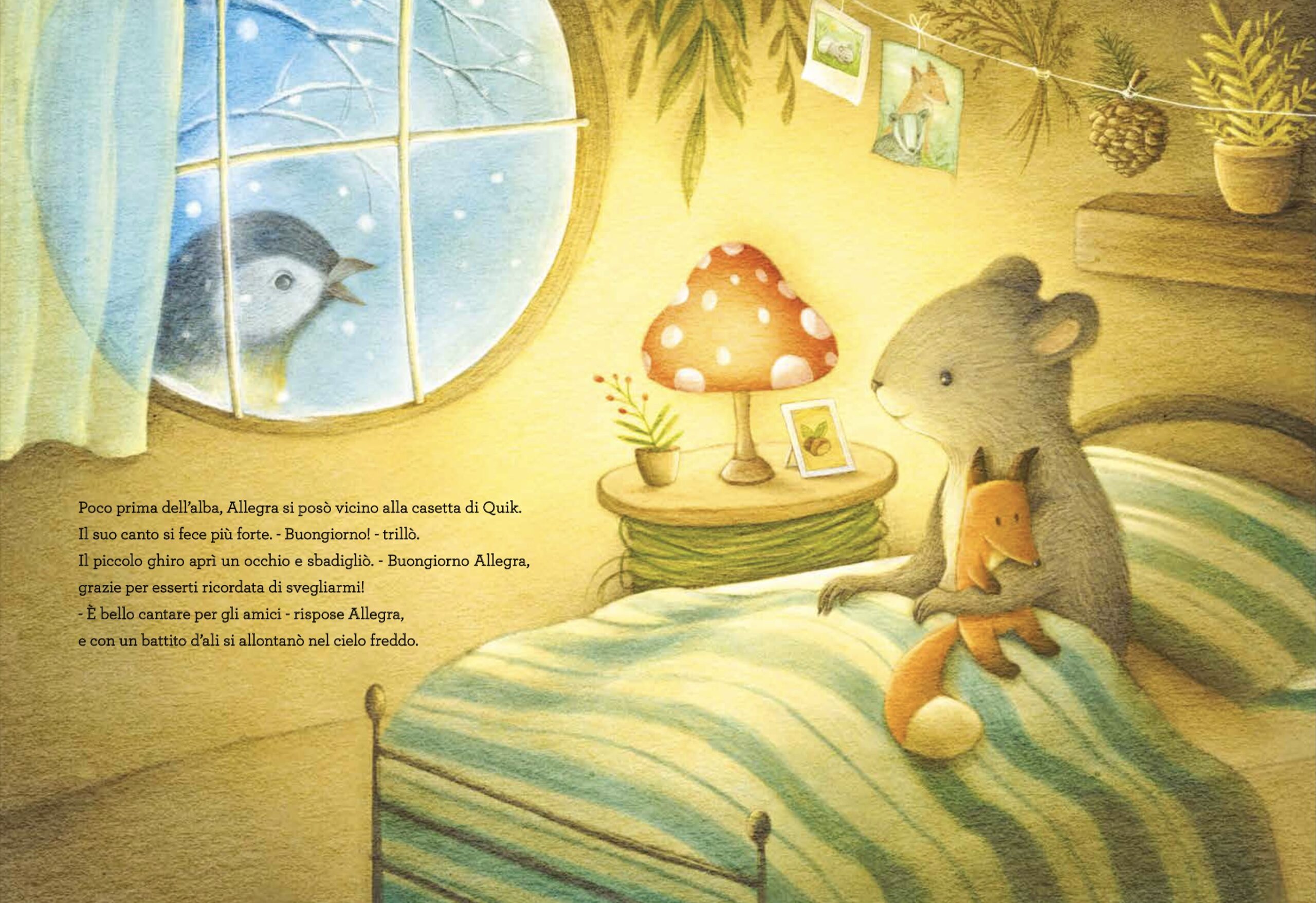 Il bosco è silenzioso, si sente solo il fruscio leggero del canto di Allegra, la cincia. Chissà che quel bel canto non riesca svegliare Quik, l’amico ghiro, che se ne dorme beato. Lui è immerso nel suo tiepido letargo e non gioca con loro, che peccato davvero, che malinconia. D’altronde, lui deve riposare. Ma la sua tana va decorata comunque….