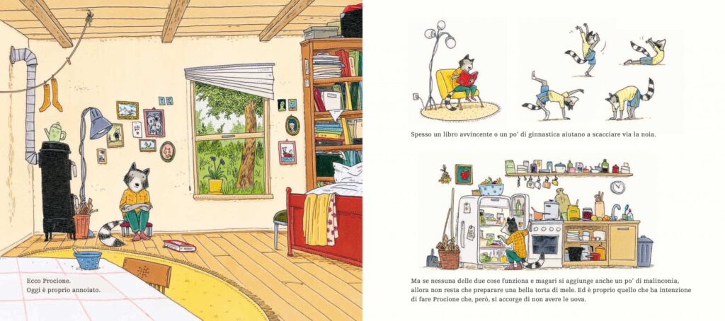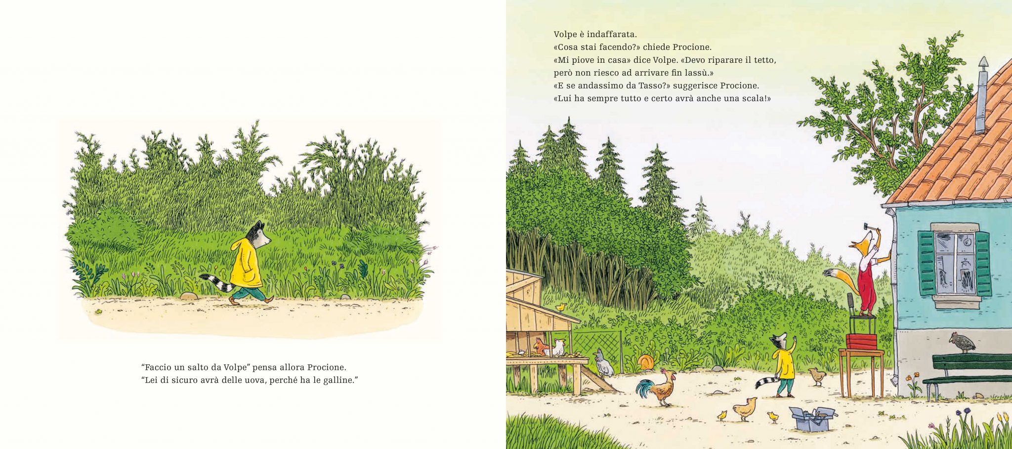 Un bel giorno Procione un po’ malinconico, fra la ginnastica e la lettura di un libro, decide di fare un bel dolce di mele per scacciare questa noia che lo affligge, ma si accorge che gli mancano le uova, va allora a chiederle a Volpe, che ha le galline, ma Volpe è molto indaffarata: deve riparare il tetto, perché le piove in casa. Accidenti però, che difficoltà insormontabile, non arriva su quel tetto così alto, si deve allora andare da chi ha tutto.