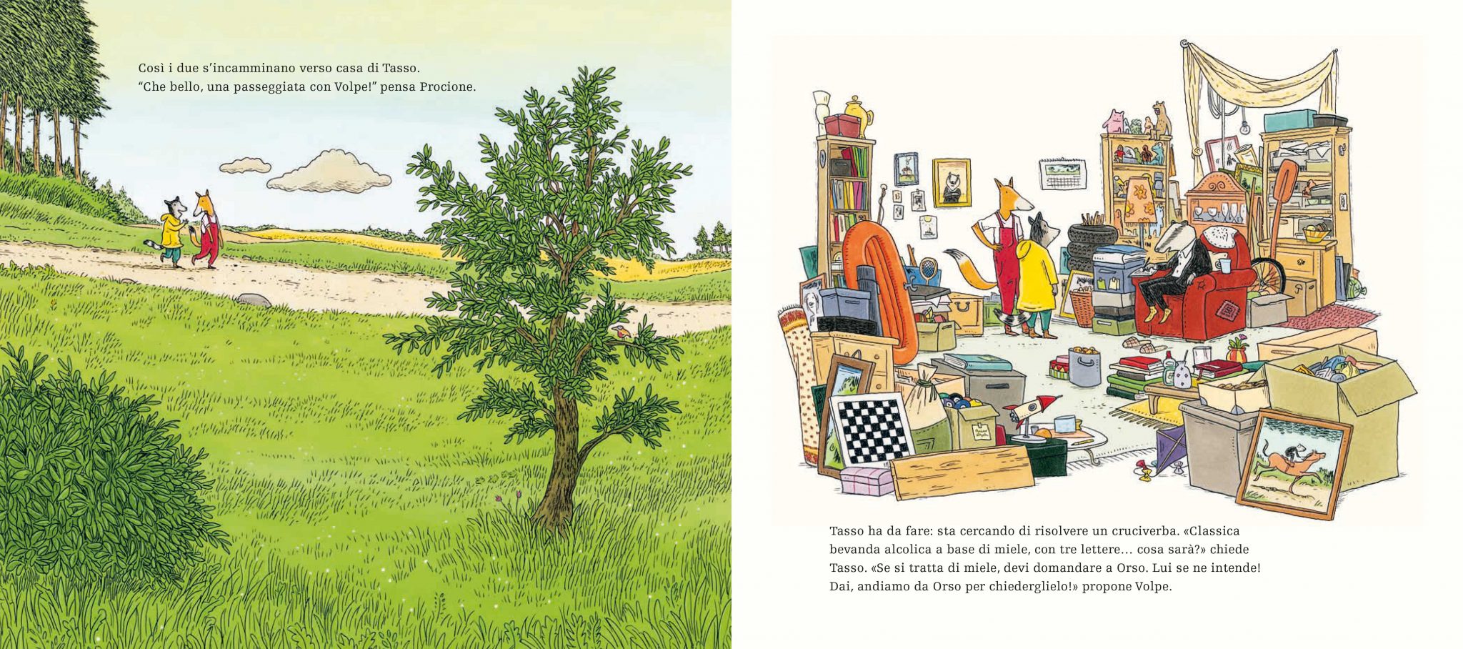 Ecco allora Procione, Volpe e Tasso incamminarsi verso la casa dell’amico. Camminando scoprono un rovo pieno di more, nulla di meglio per una bella pausa golosa, un bel picnic fra amici. Arrivati alla casetta nel bosco di Orso (una casetta dai tratti deliziosi, come quelle che sin vedono nelle fiabe e che tanto vorremmo avere), Corvo dice (gracchia) loro che l’orso è andato al ruscello a pescare…