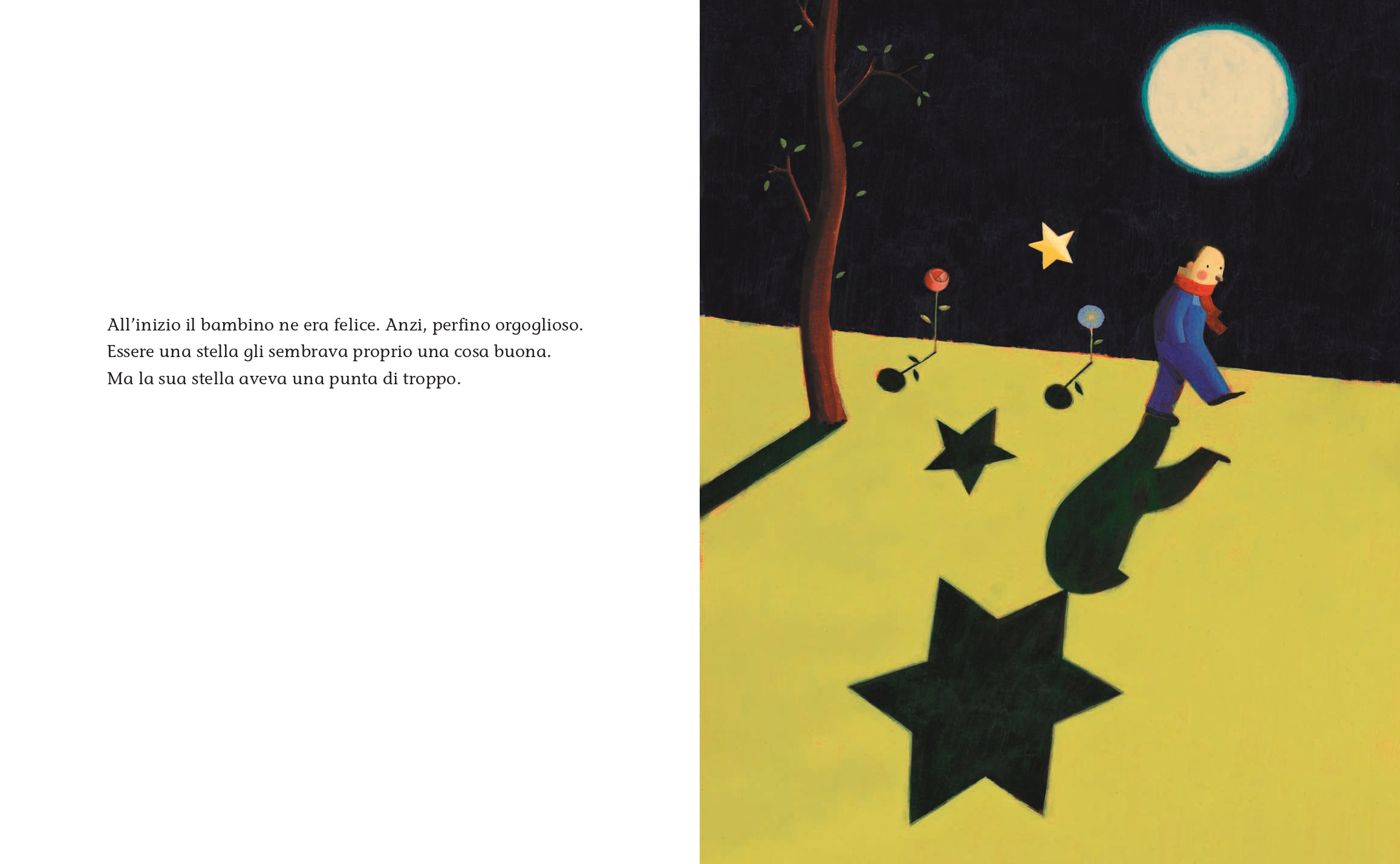 C’era una volta un bambino che non sapeva di essere una stella. Quando glielo dissero, all’inizio ne fu felice, perfino orgoglioso: sembrava una cosa bella. Ma la sua stella, ahimè, aveva una punta di troppo. Così, poco a poco, cominciò a provare vergogna… E più si vergognava, più la stella cresceva. Dopo un po’, il bambino non si vedeva nemmeno più: si vedeva solo la stella dentro di lui. Qualcosa che cresceva e travolgeva.