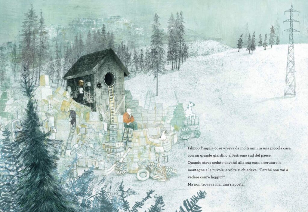 Un uomo solitario, Filippo l’impila-cose, passa il suo tempo accatastando oggetti in pile ordinate nel suo immenso giardino, all’estremo sud del paese. Chi vive nel villaggio gli lascia volentieri diverse vecchie cose ormai in disuso. Tegole, ceste, cassette e scatole, persino valigie. Tutto viene lasciato in un terribile disordine intorno alla sua casa. Il suo cane sempre accanto, mentre lui impila oggetti e impila ancora.