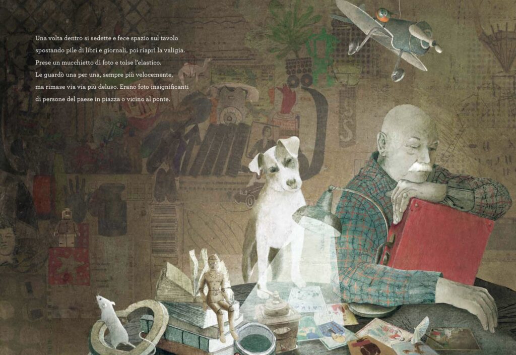 Cadendo sull’erba, quella valigia si è aperta, ne escono mazzetti di foto, lettere, cartoline e francobolli. Ricordo quando camminavo lungo le rive della Senna, a Parigi, e dai bouquinistes trovavo fotografie, lettere e cartoline. La fantasia volava subito lontano, a immaginare storie e vite, avventure lontane e romantiche, il desiderio di scappare.