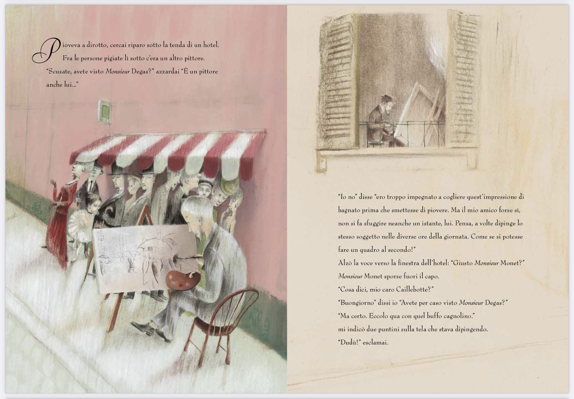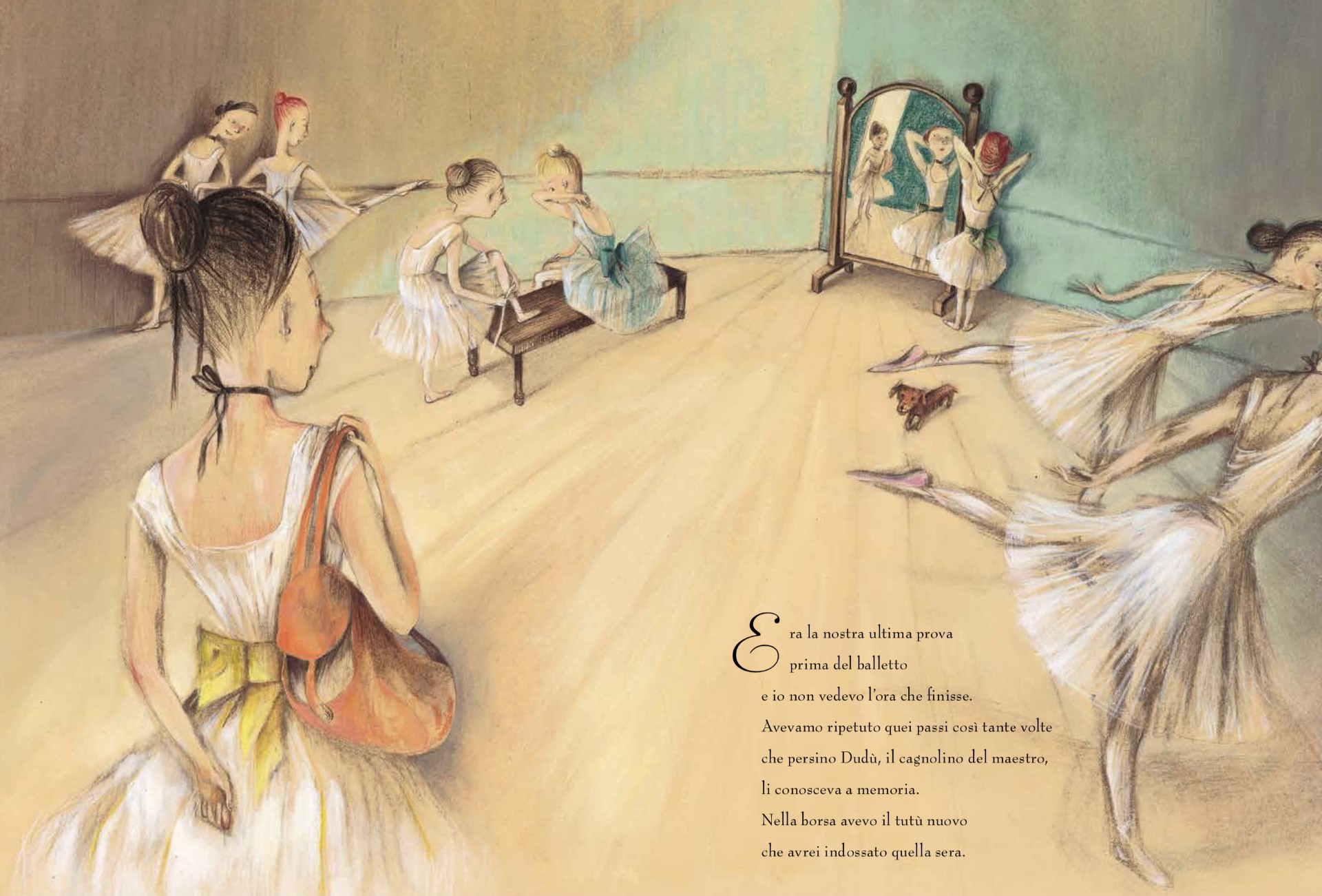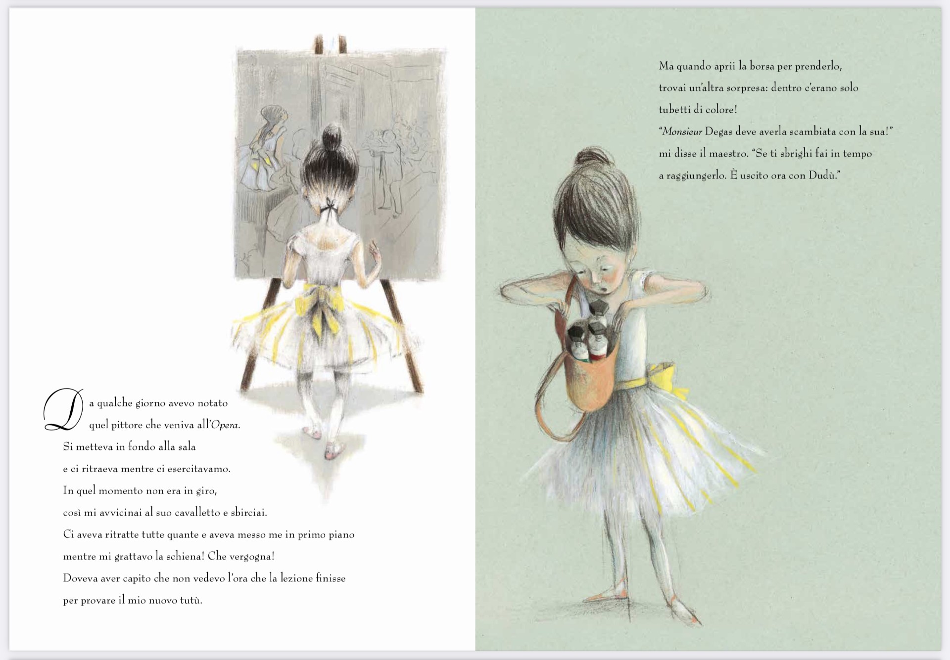 Ottocento, Parigi – città del cuore, città nel cuore – e una giovane ballerina dell’Opera, che, al termine delle interminabili e dure prove generali, scopre di aver scambiato la sua borsa con quella di Monsieur Edgar Degas, il pittore che per mesi ha ritratto le ballerine mentre danzano, si riposano e chiacchierano. Accanto a lui all’Opera, il fedele cagnolino Dudù che quasi quasi conosce, ormai, anche lui i leggeri e delicati passi di danza.