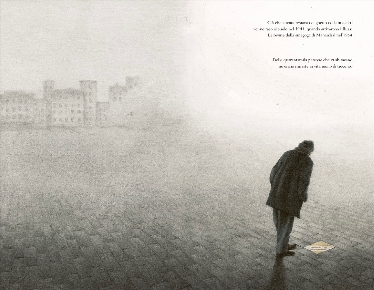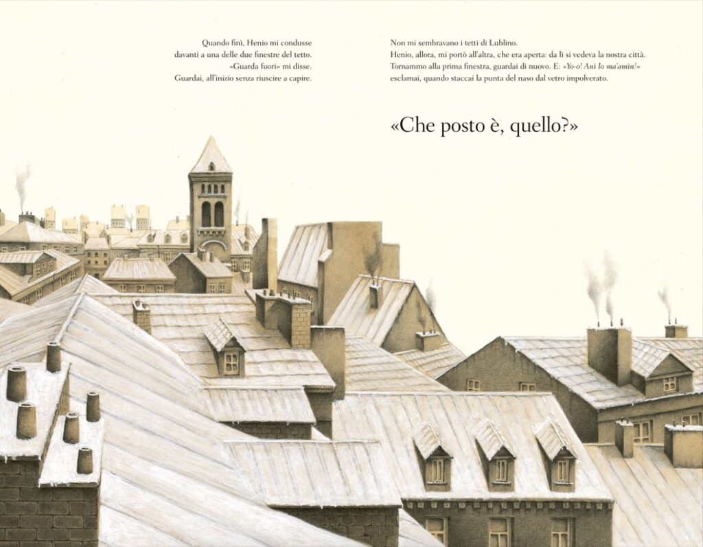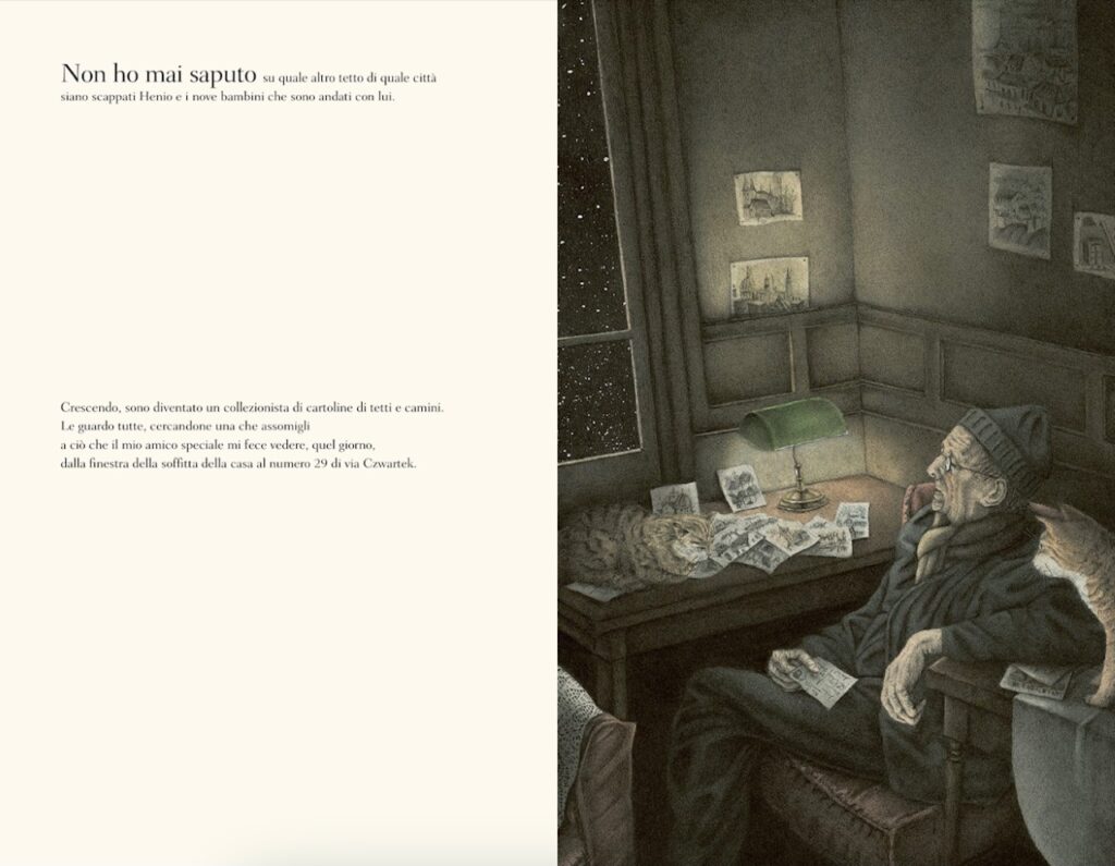 “Ciò che ancora restava del ghetto della mia città venne raso al suolo nel 1944, quando arrivarono i Russi. (…) Delle quarantamila persone che ci abitavano, ne erano rimaste in vita meno di trecento. Non ho mai saputo su quale altro tetto di quale città siano scappati Henio e i nove bambini che sono andati con lui. Crescendo, sono diventato un collezionista di cartoline di tetti e camini. Le guardo tutte, cercandone una che assomigli a ciò che il mio amico speciale mi fece vedere, quel giorno dalla finestra della soffitta della casa al numero 29 di via Czwartek”.